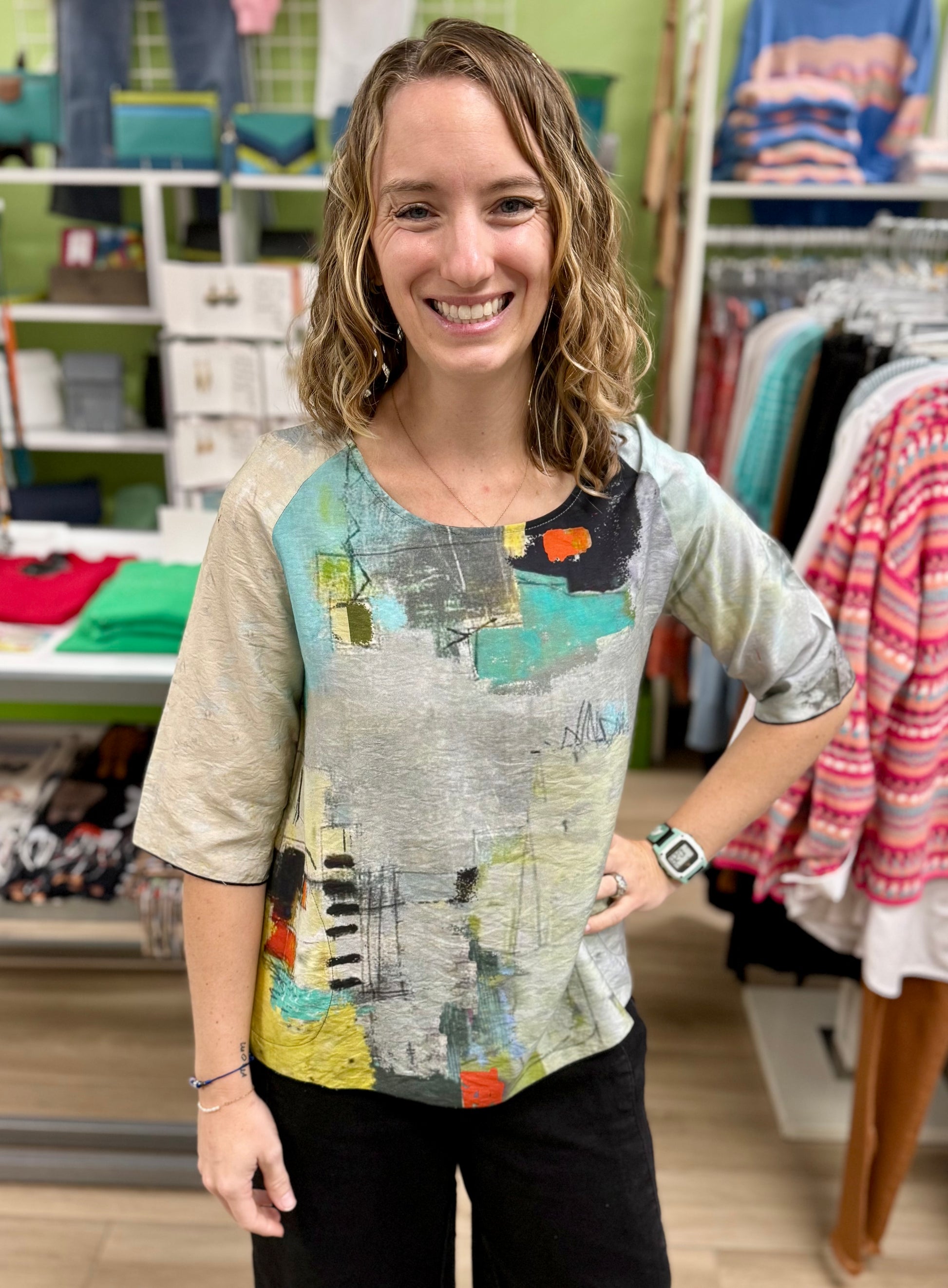 THIS IS NOT A SET PRINT - Your shirt may or may NOT have the print fall in the same place as the model in the photo. These tops are printed fabric that is then cut and sewn so that each item is completely unique. They are not printed after manufacturing to guarantee a consistent print placement. While the colors and design are the same as shown in the photo the print placement will most likely vary!