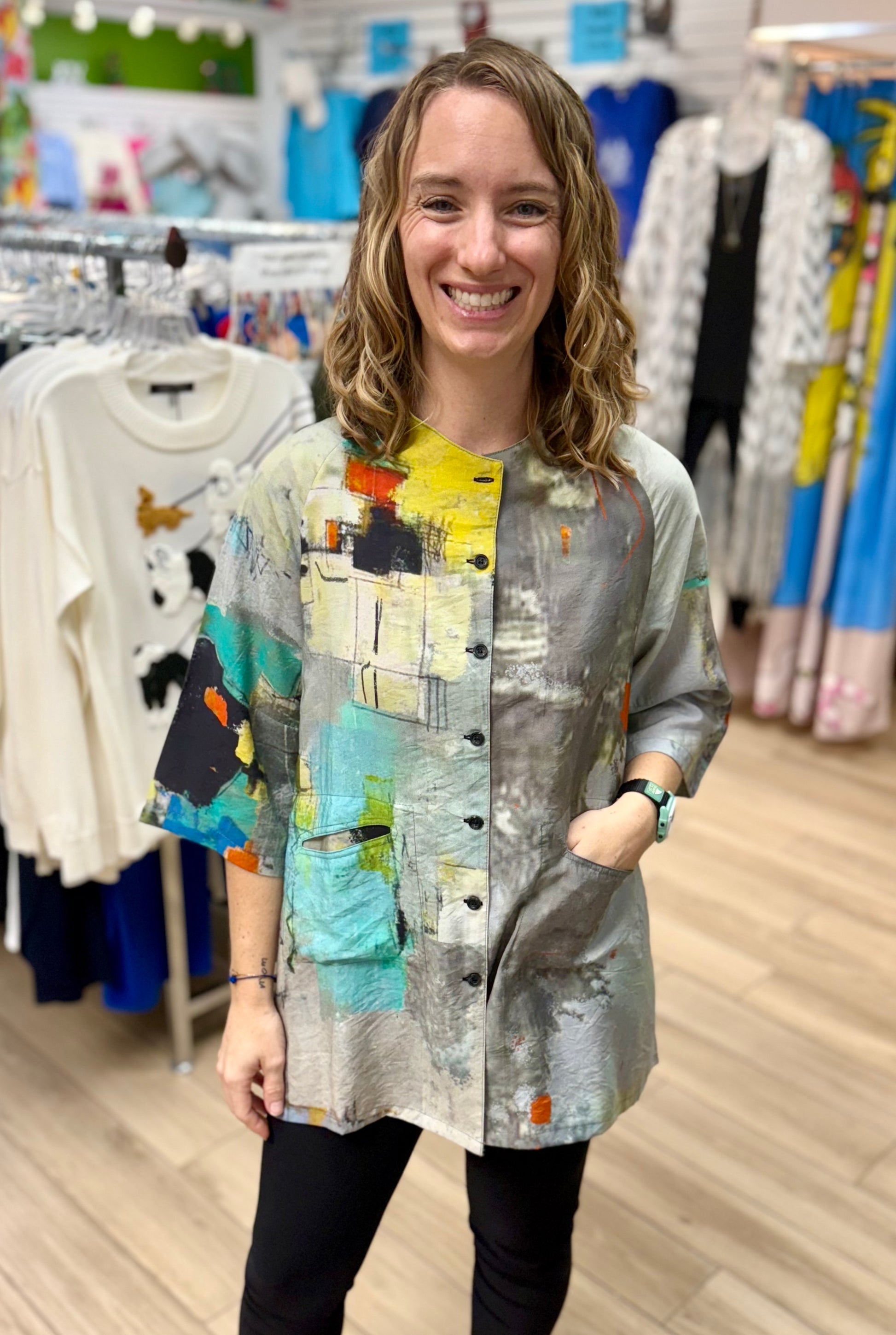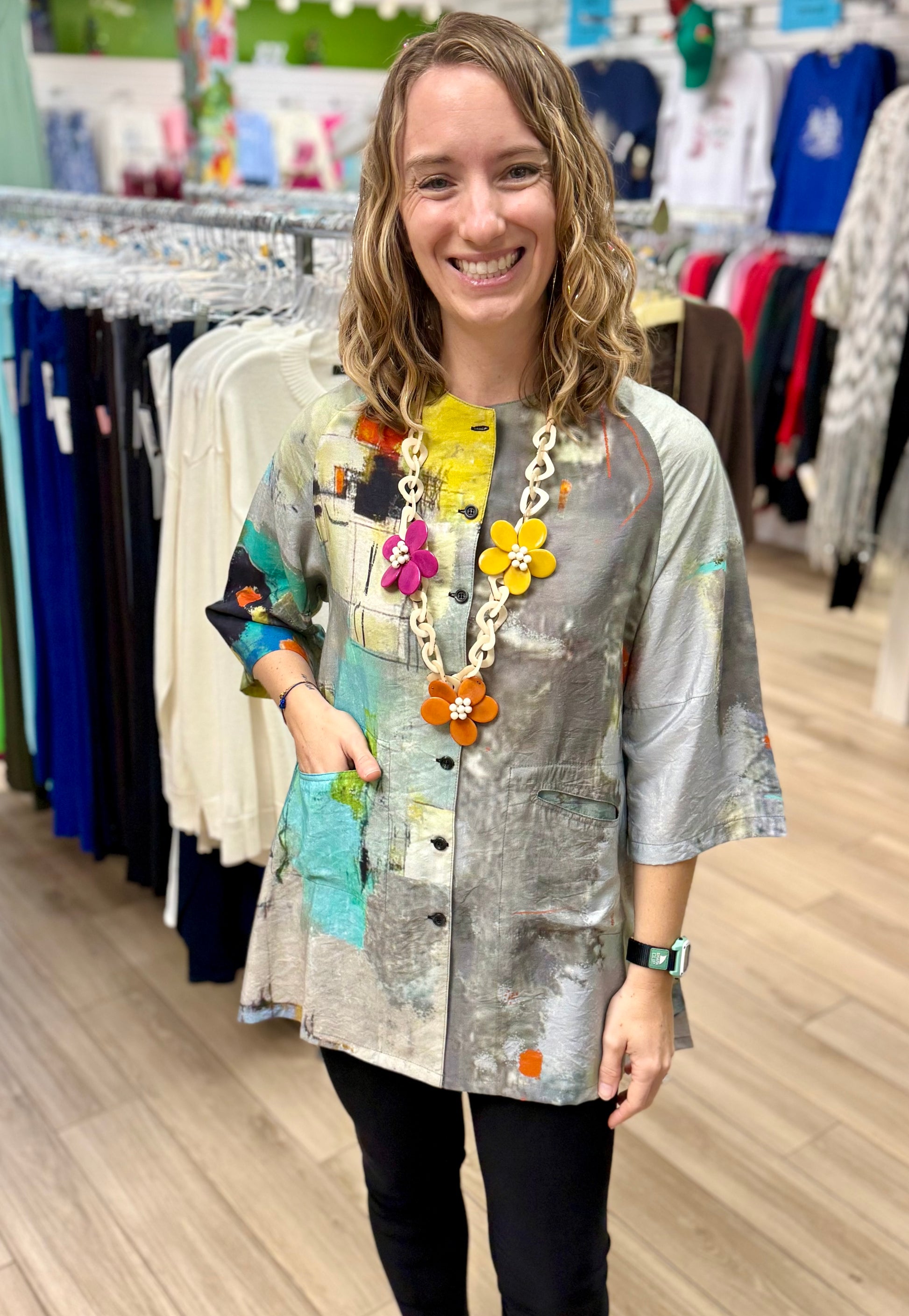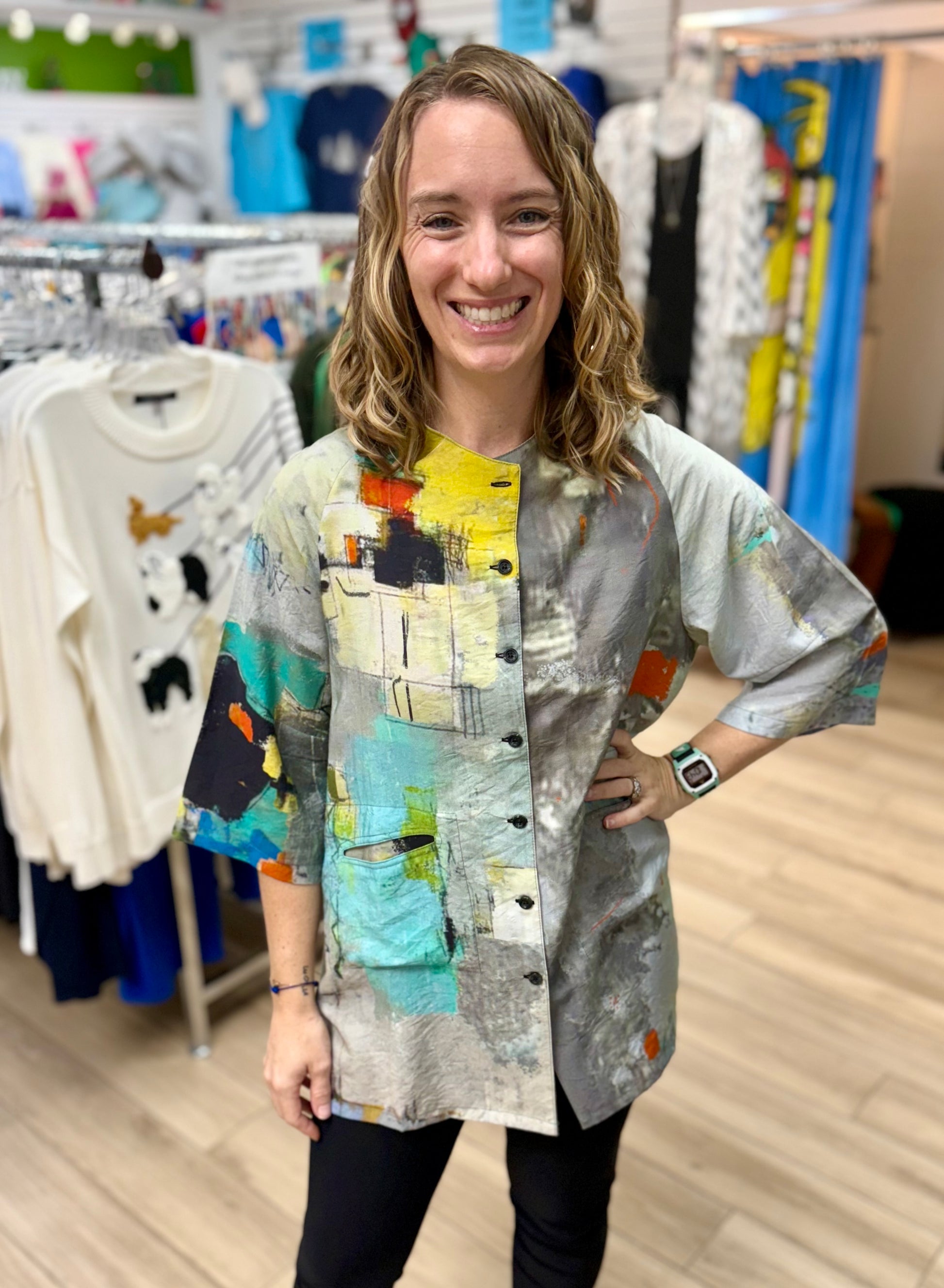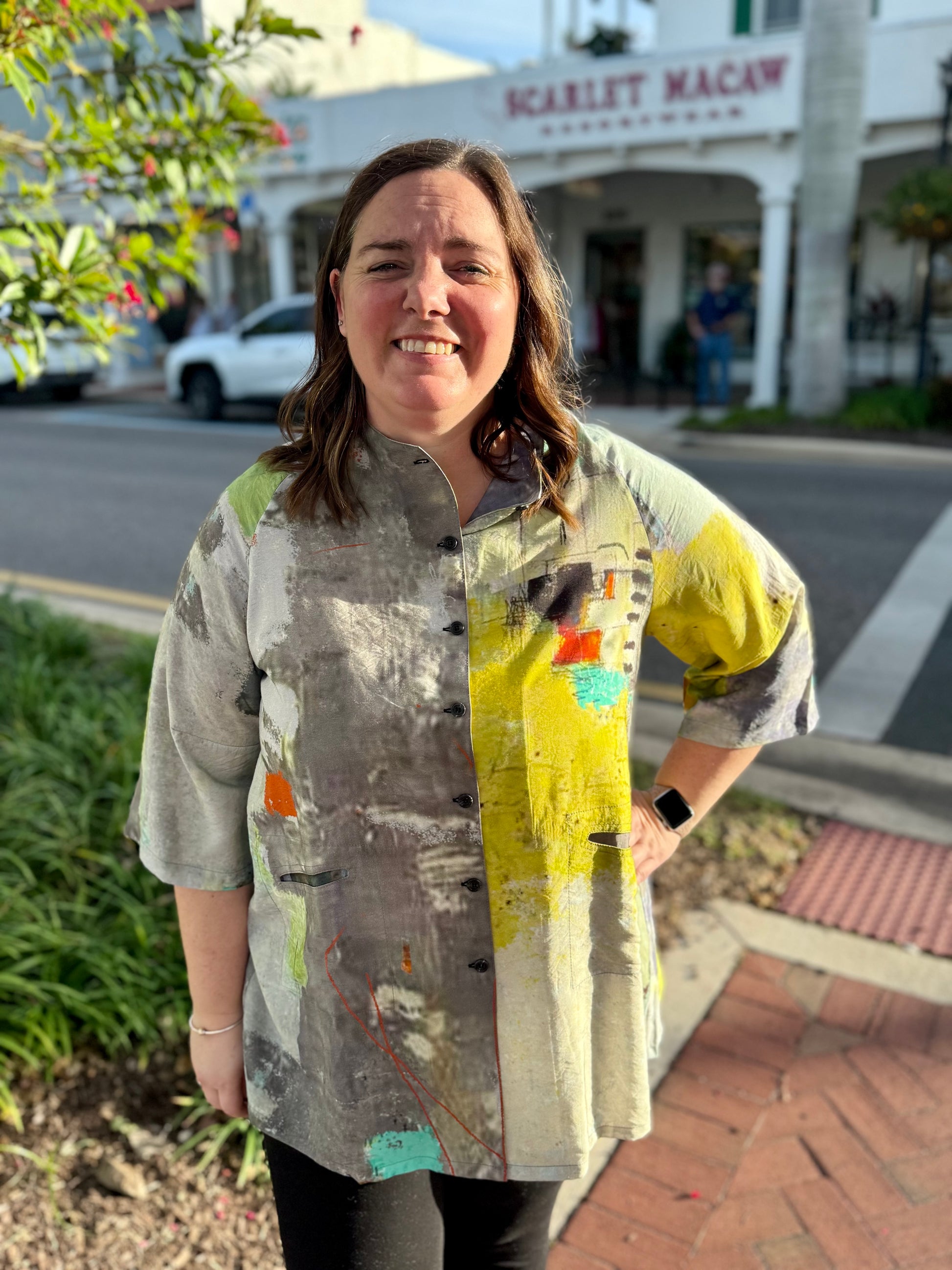 THIS IS NOT A SET PRINT - Your shirt may or may NOT have the print fall in the same place as the model in the photo. These tops are printed fabric that is then cut and sewn so that each item is completely unique. They are not printed after manufacturing to guarantee a consistent print placement. While the colors and design are the same as shown in the photo the print placement will most likely vary!