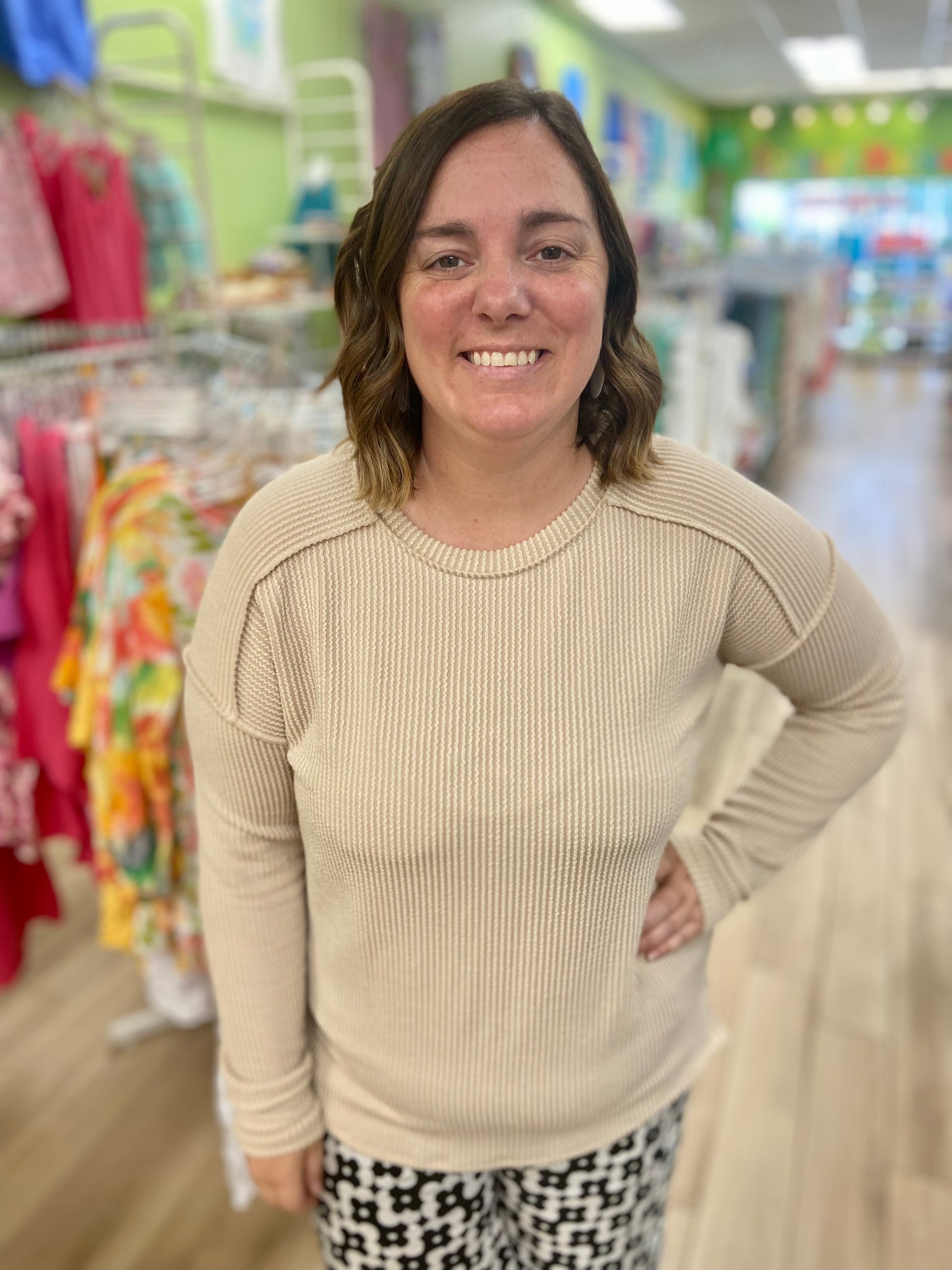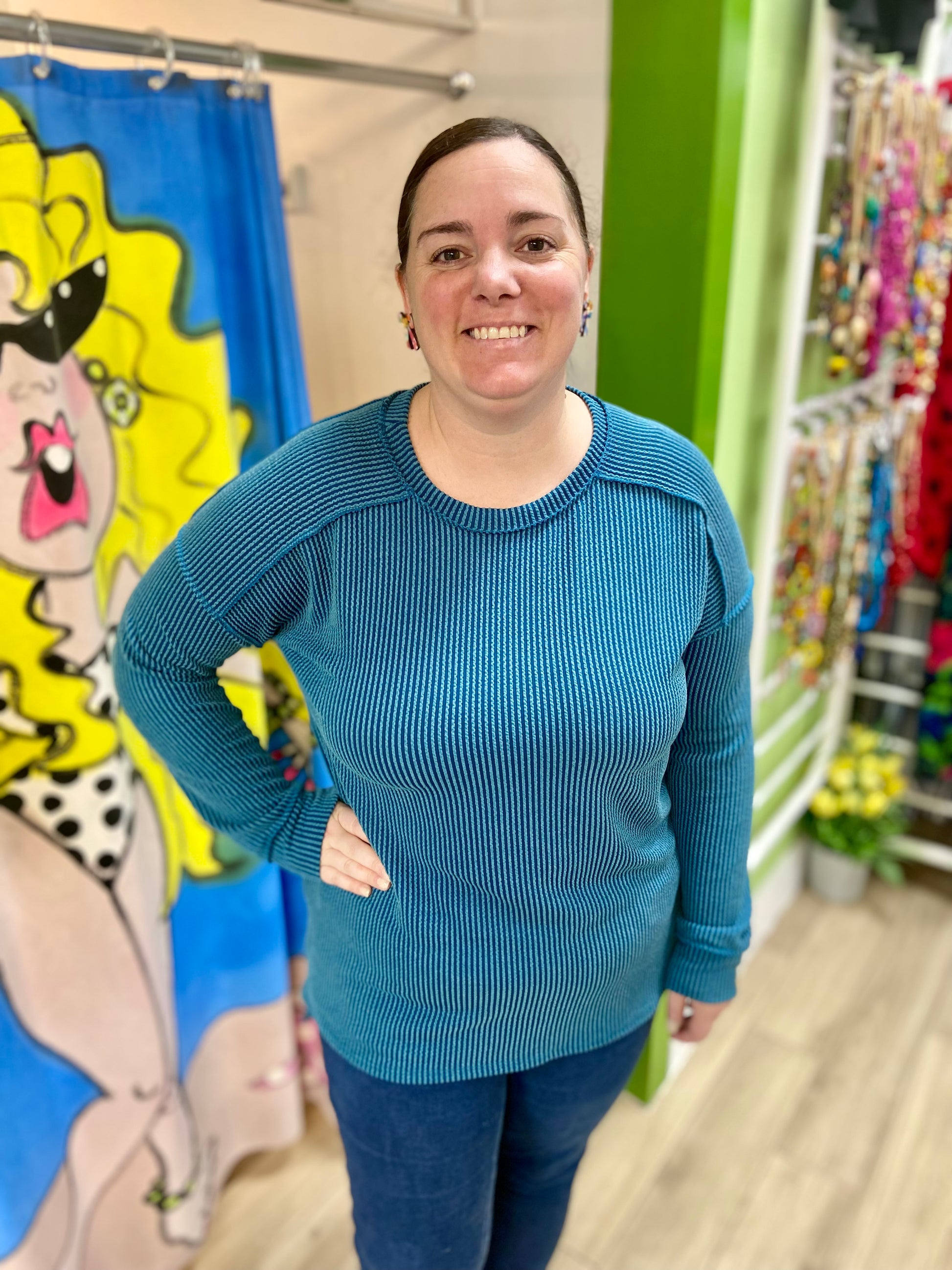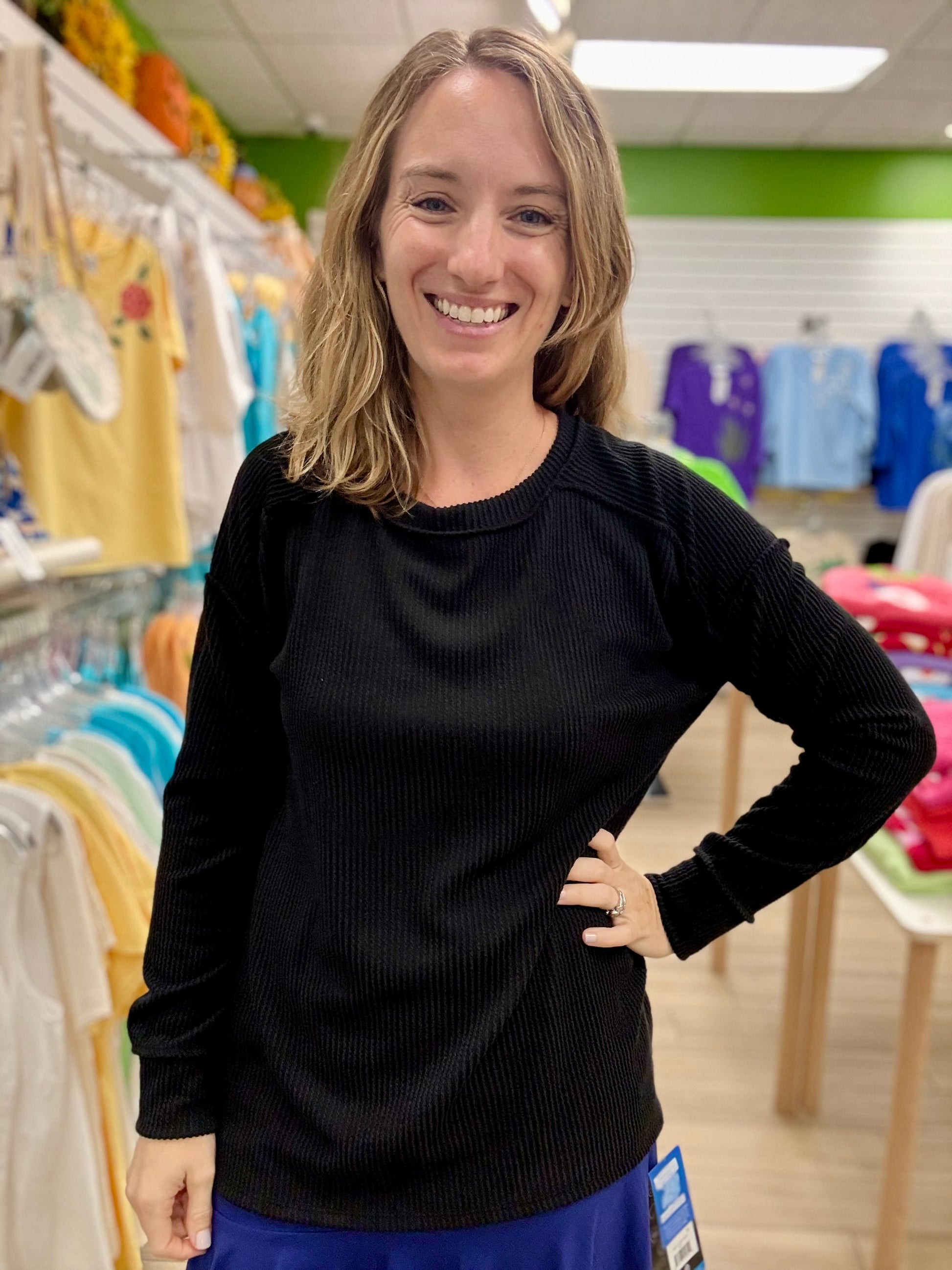 Our most popular corded fabric is ready for cooler days in a cute long sleeve style featuring a drop shoulder and dolman sleeve.