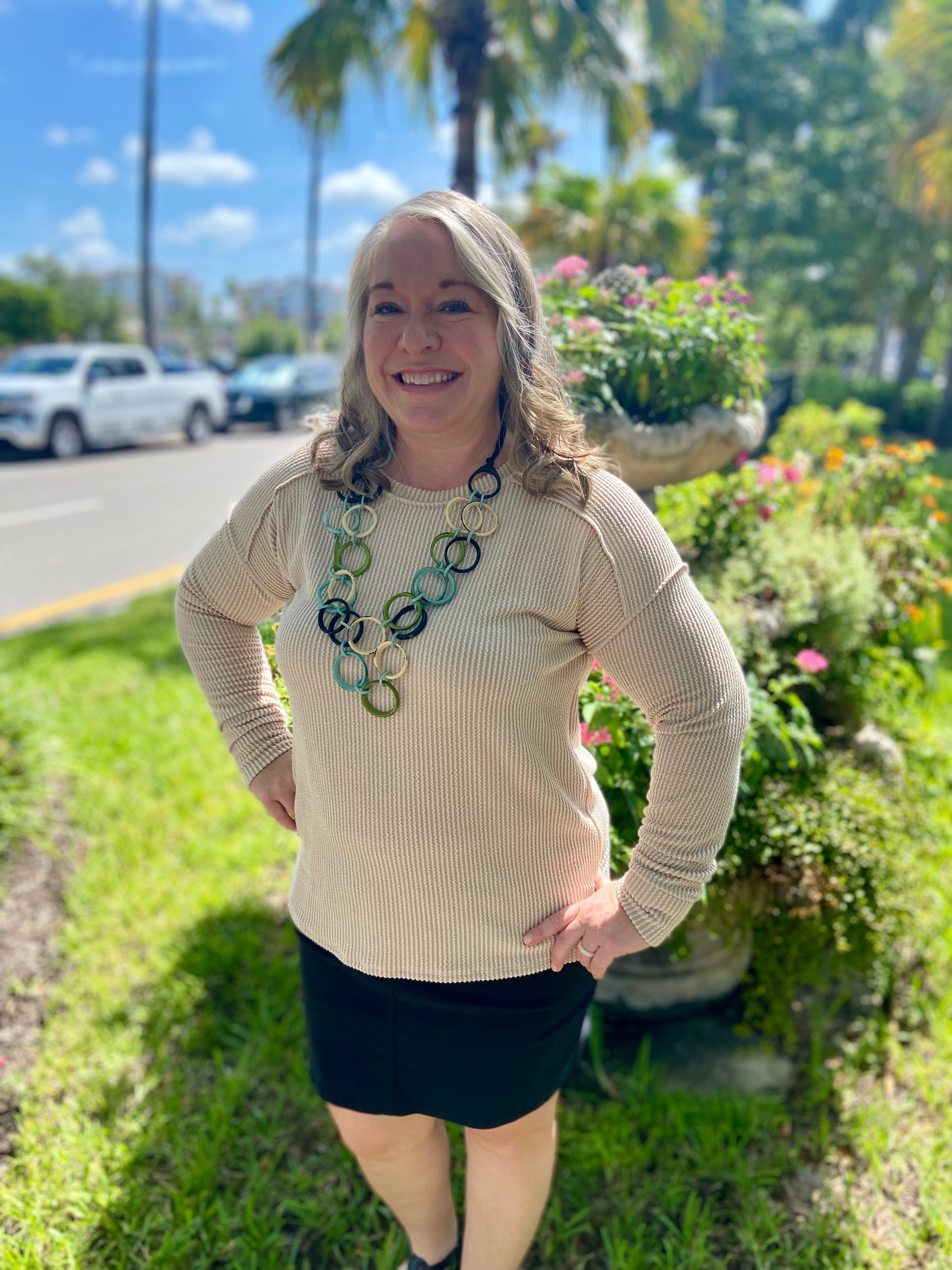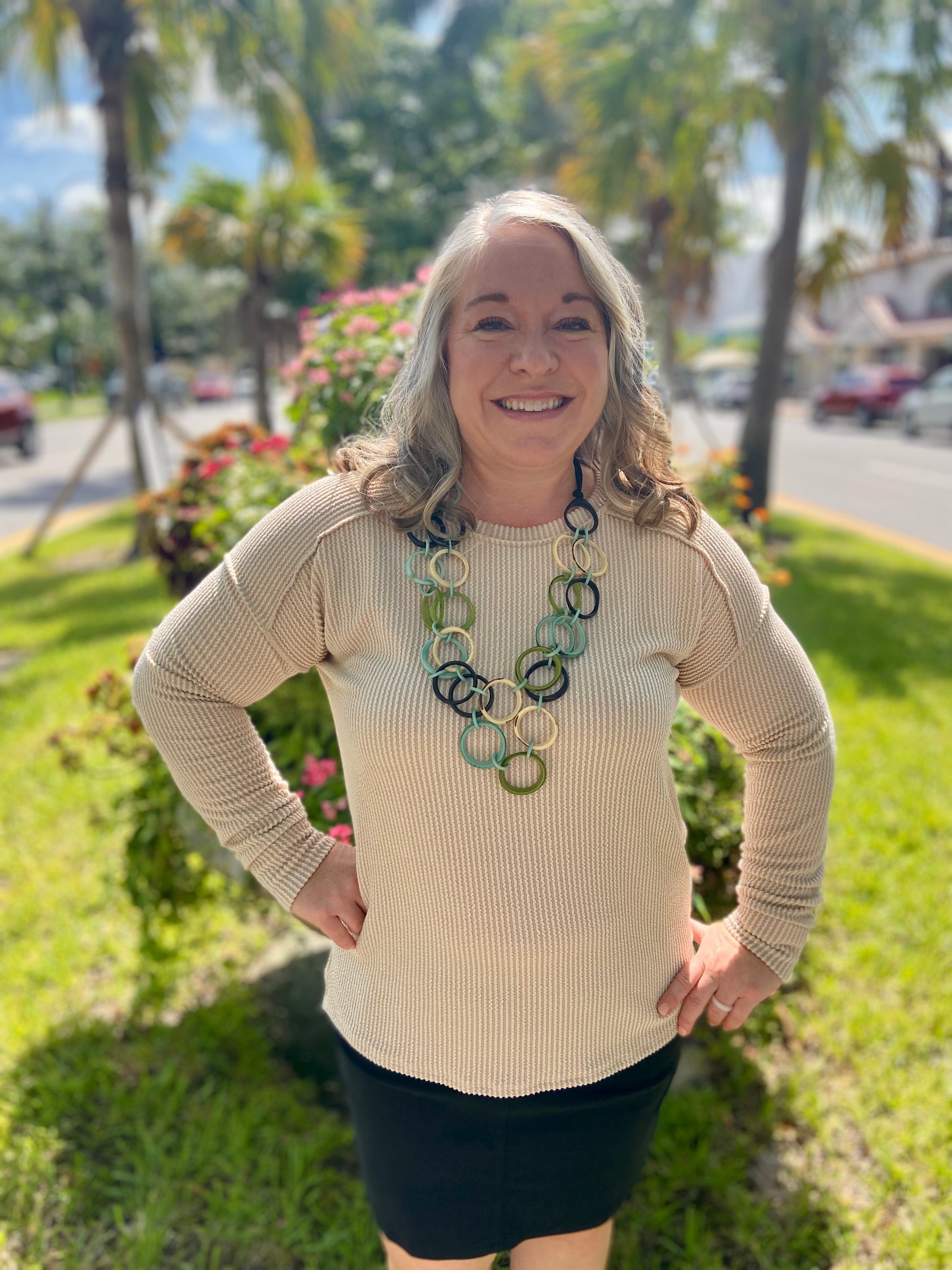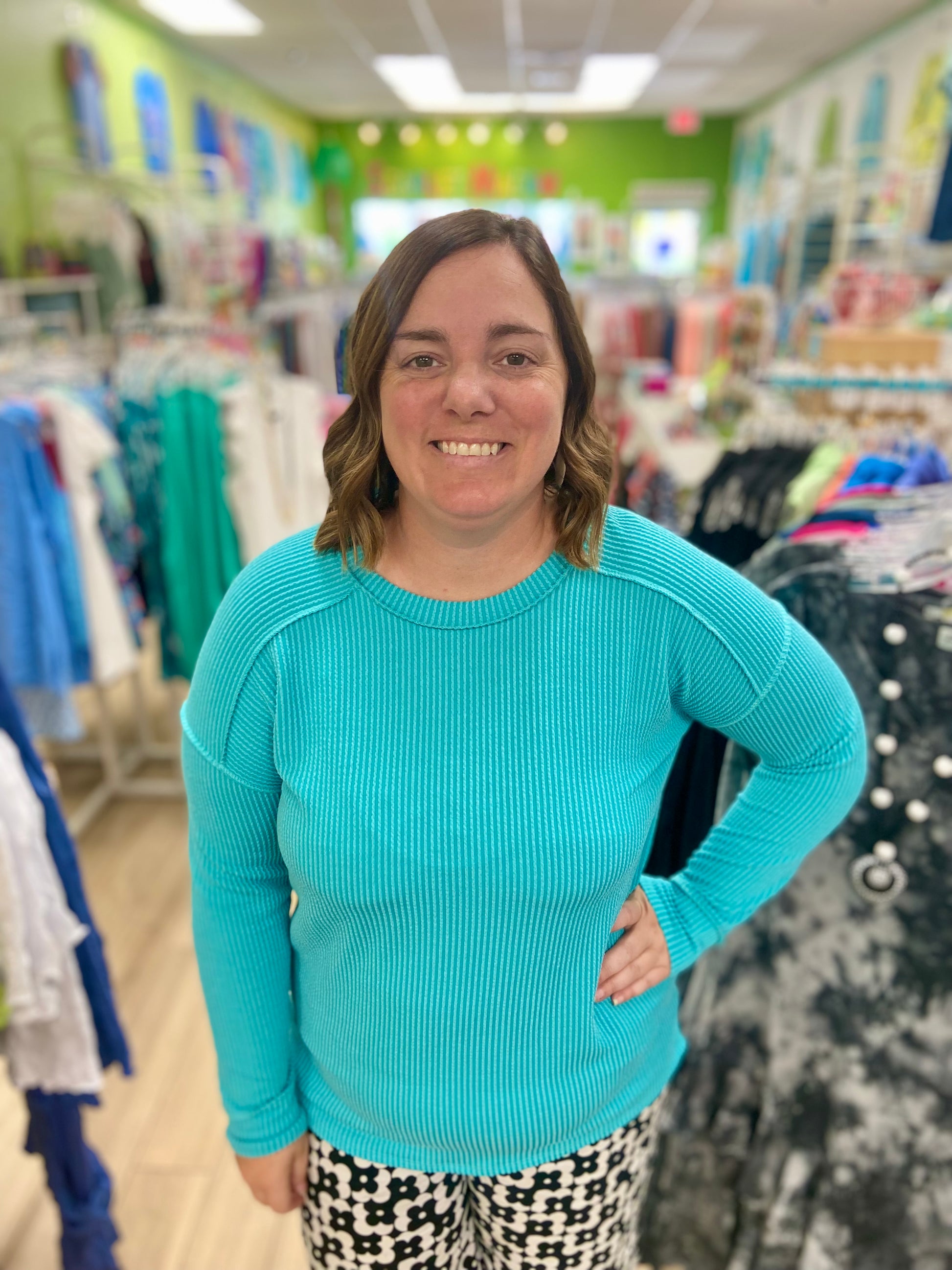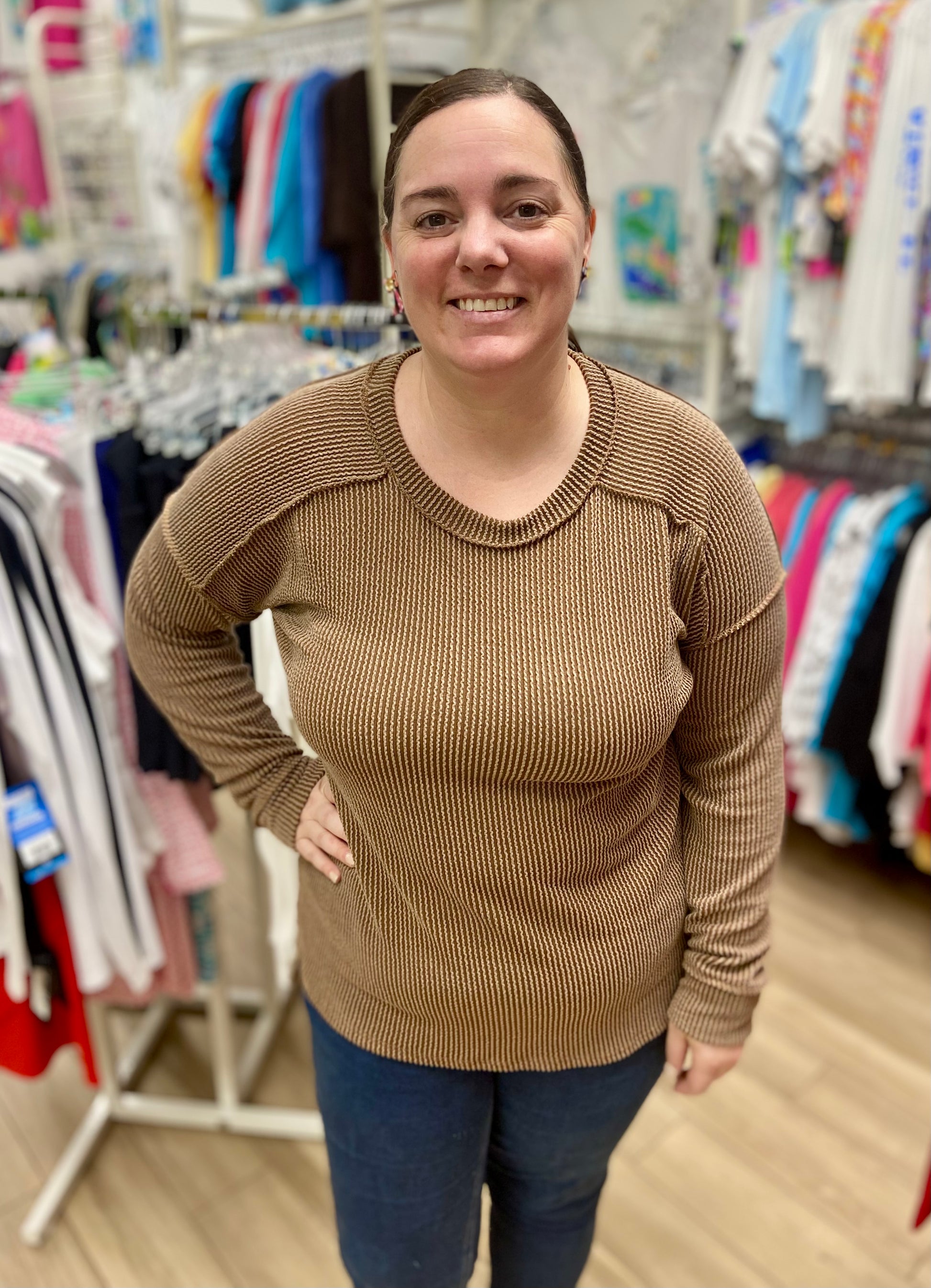 Our most popular corded fabric is ready for cooler days in a cute long sleeve style featuring a drop shoulder and dolman sleeve.