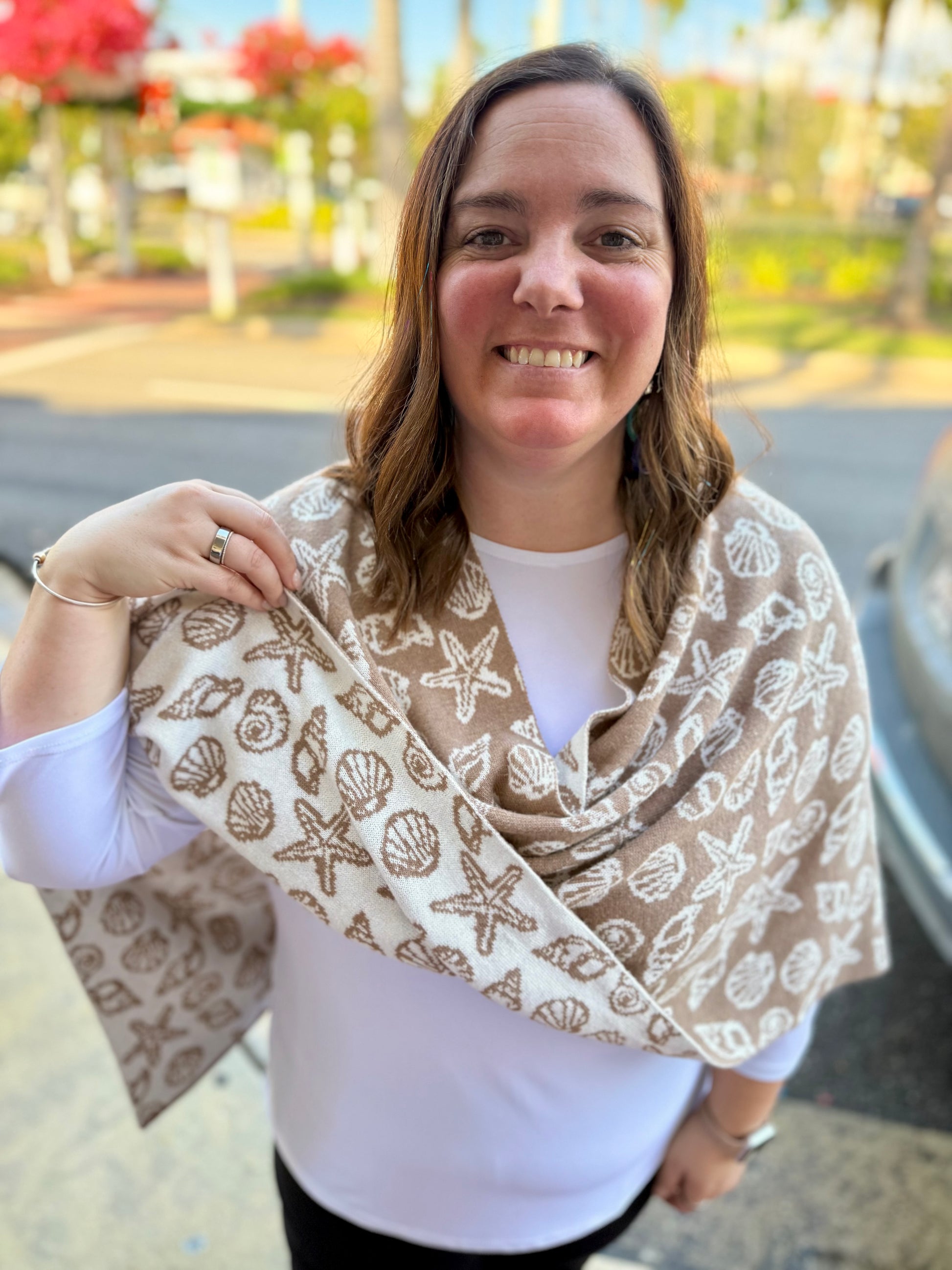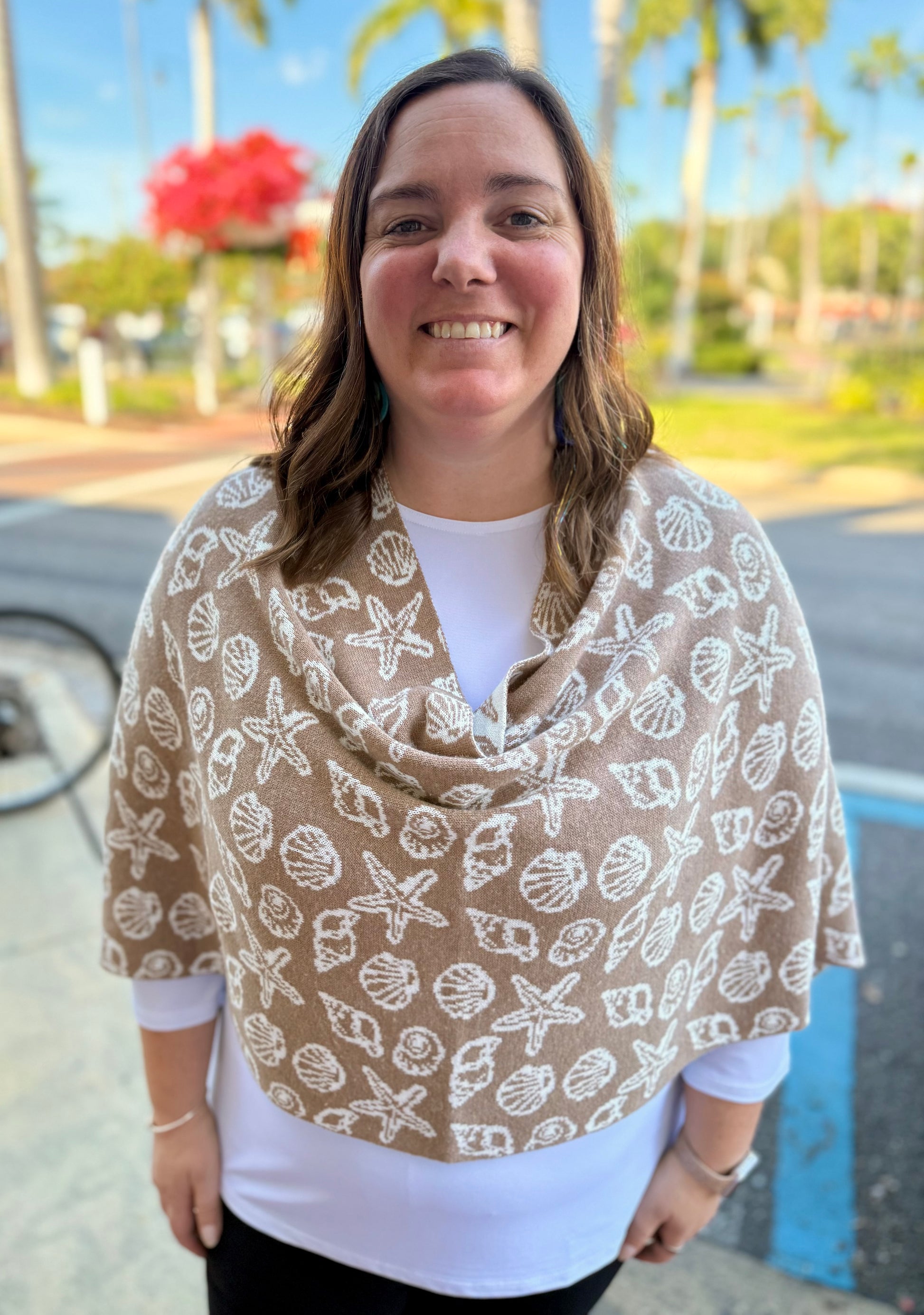 A beautiful poncho covered in shells! This style is sure to make you smile whether you wear it as a scarf or a poncho. Even better - you can wear it on either color side for extra fun!