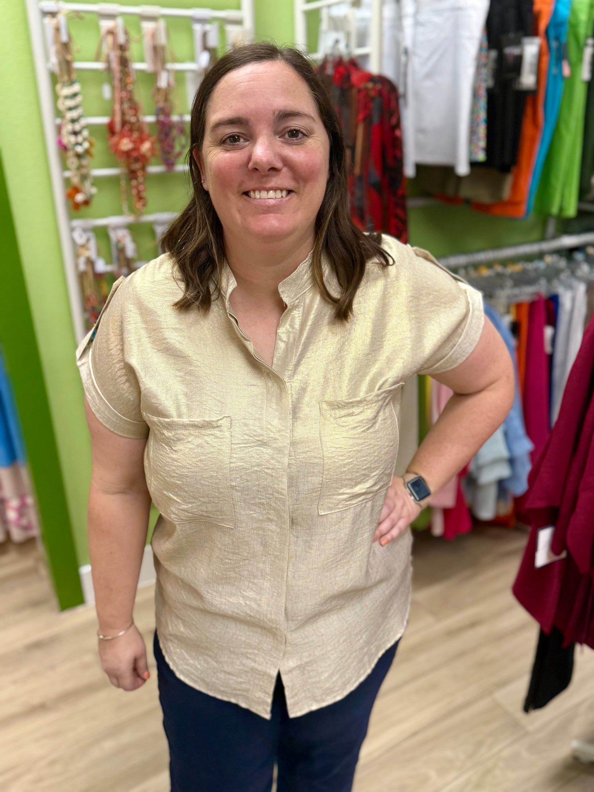 Shine this season in a gorgeous sparkling top! Flattering pockets, a stylish silhouette and a fun sheen make this top a sure thing!