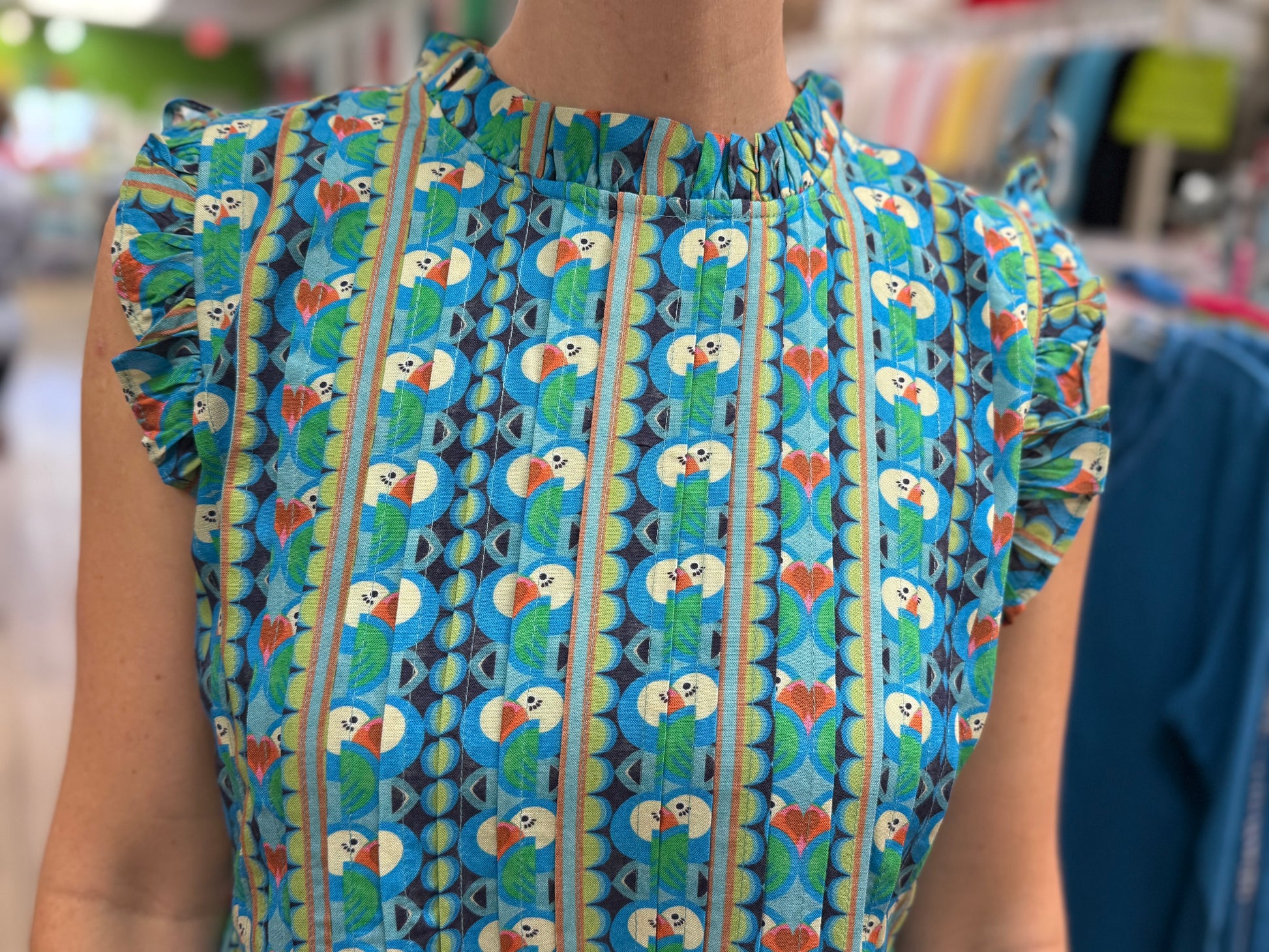 This stunning maxi dress features an all over toucan print and wonderfull details like pleats and tiers.