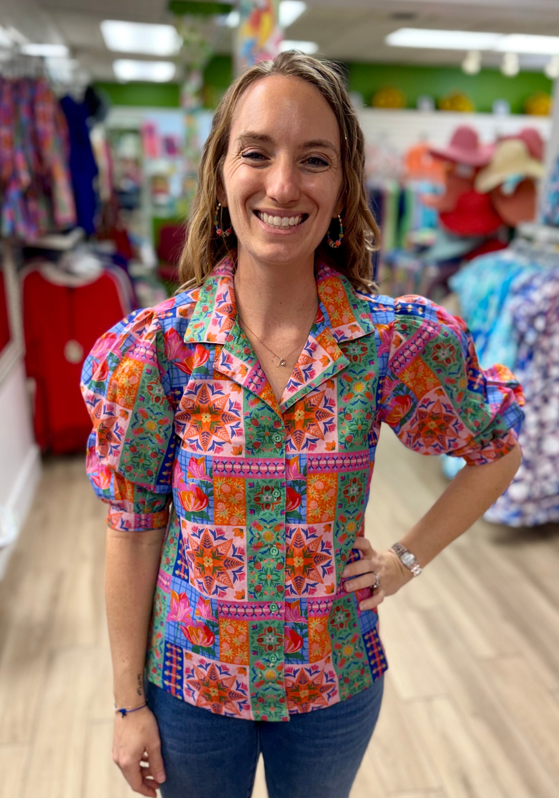This cute button down has a puff sleeve and a gorgeous print. You are sure to look great in these lovely colors.