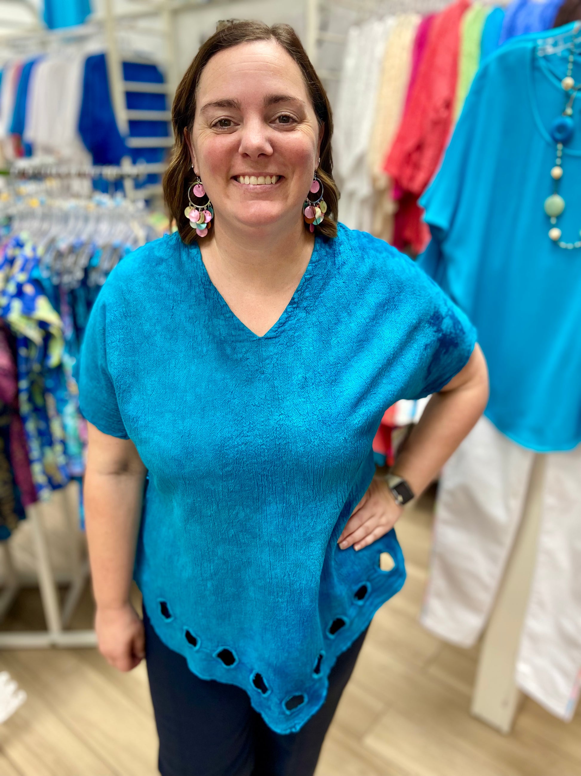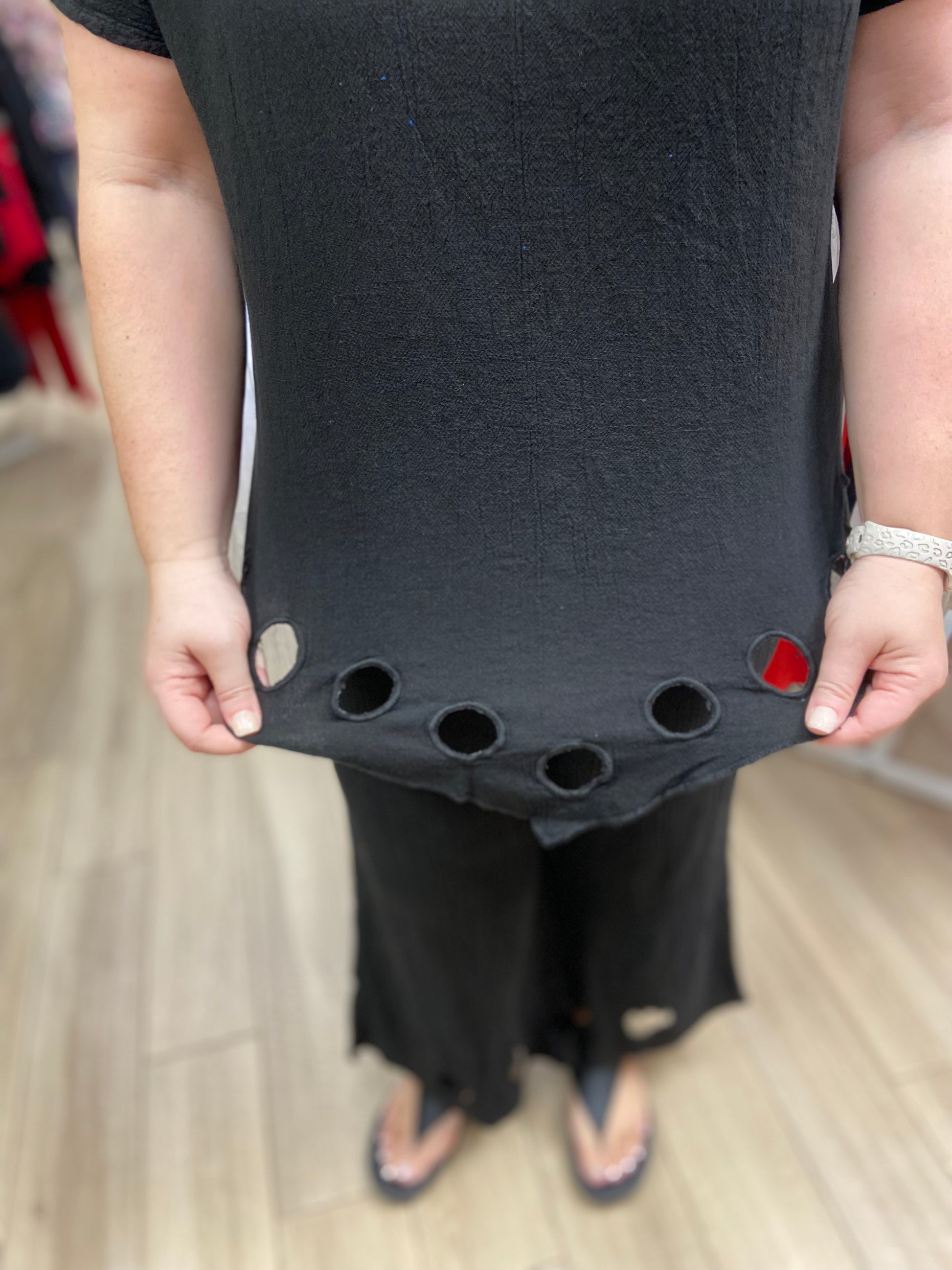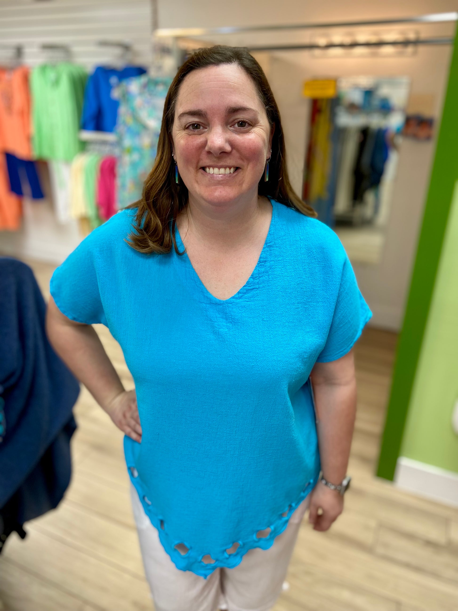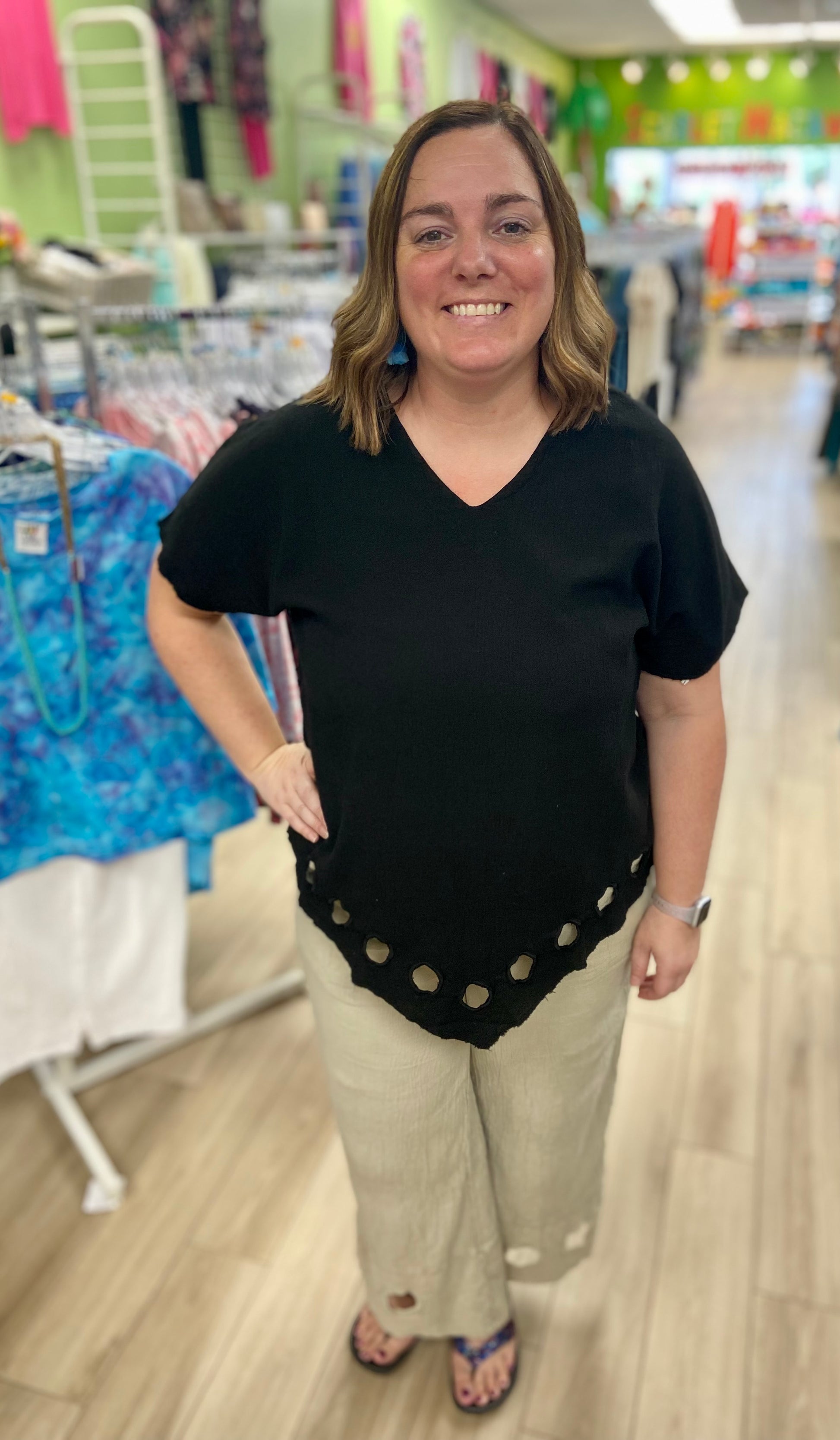 These pointed-hem top features circle cut-outs around the bottom for added fun & style!