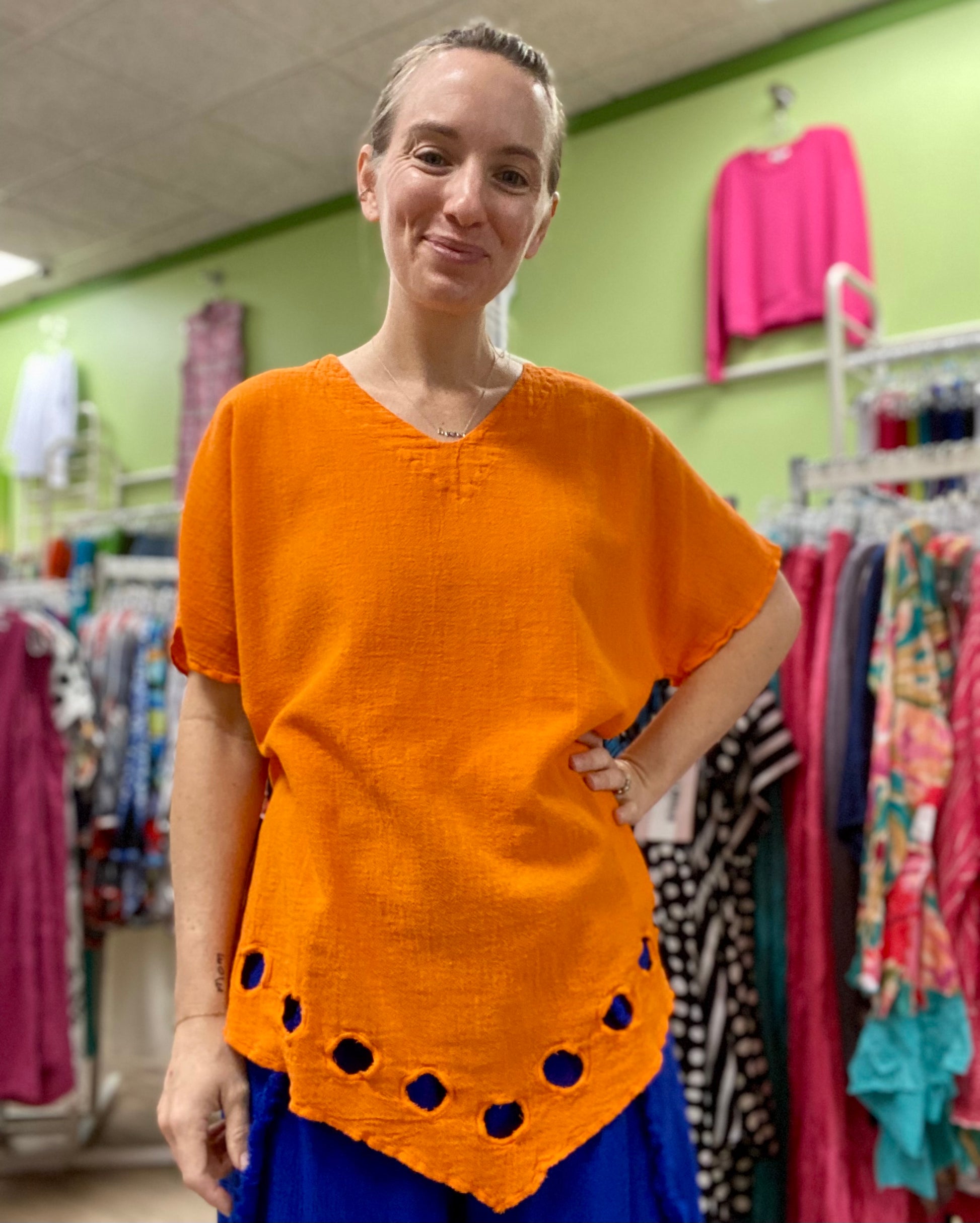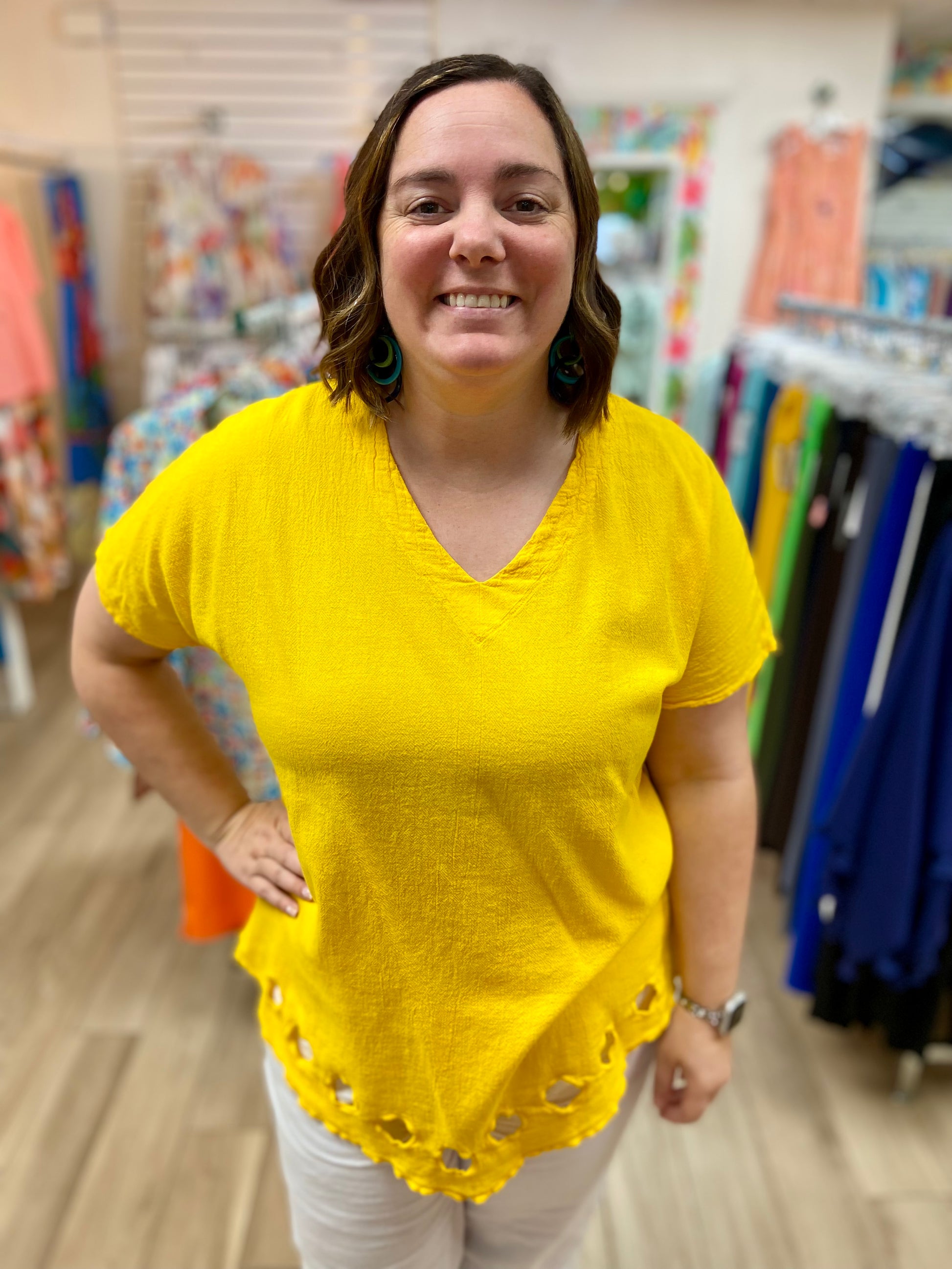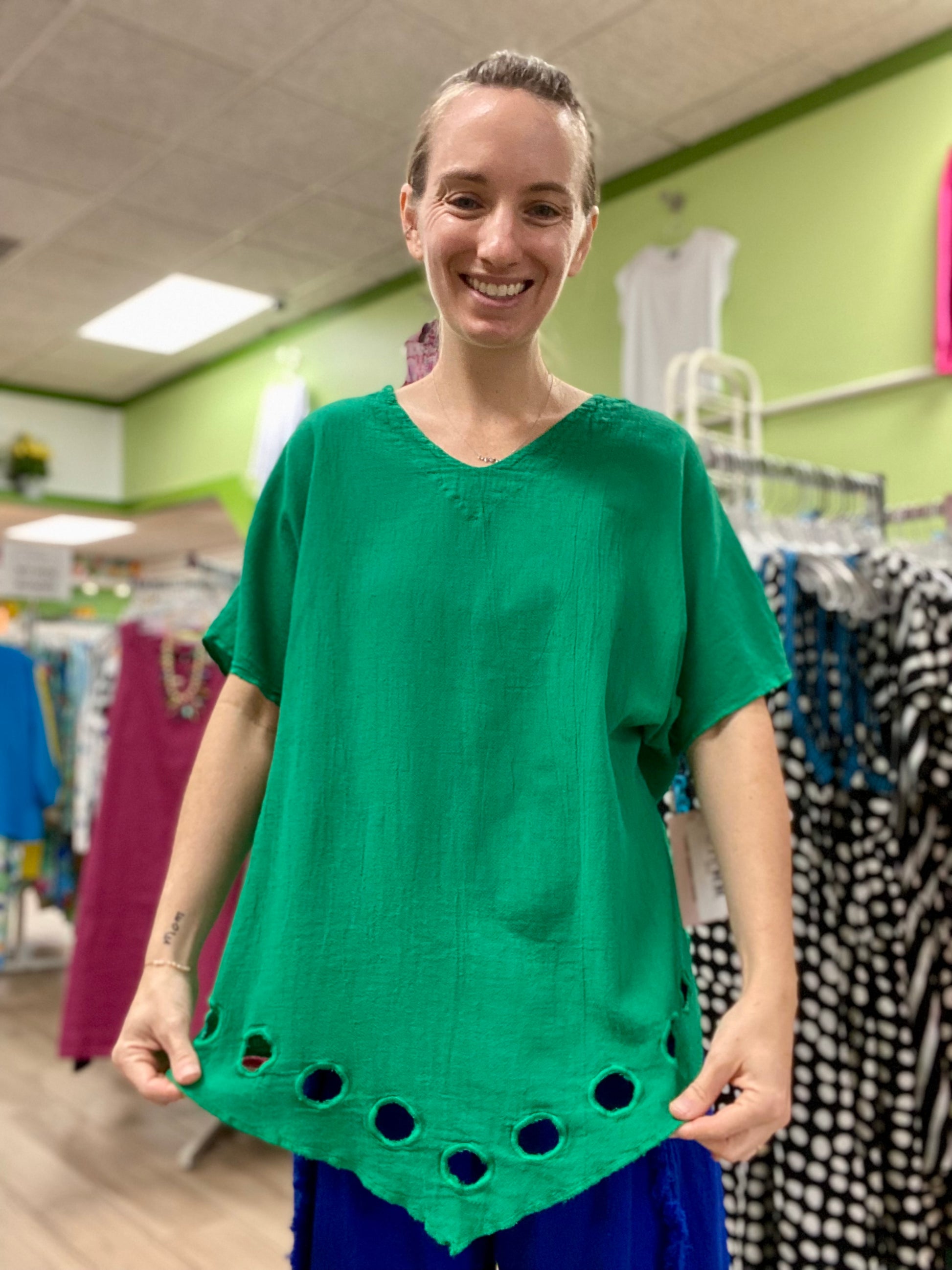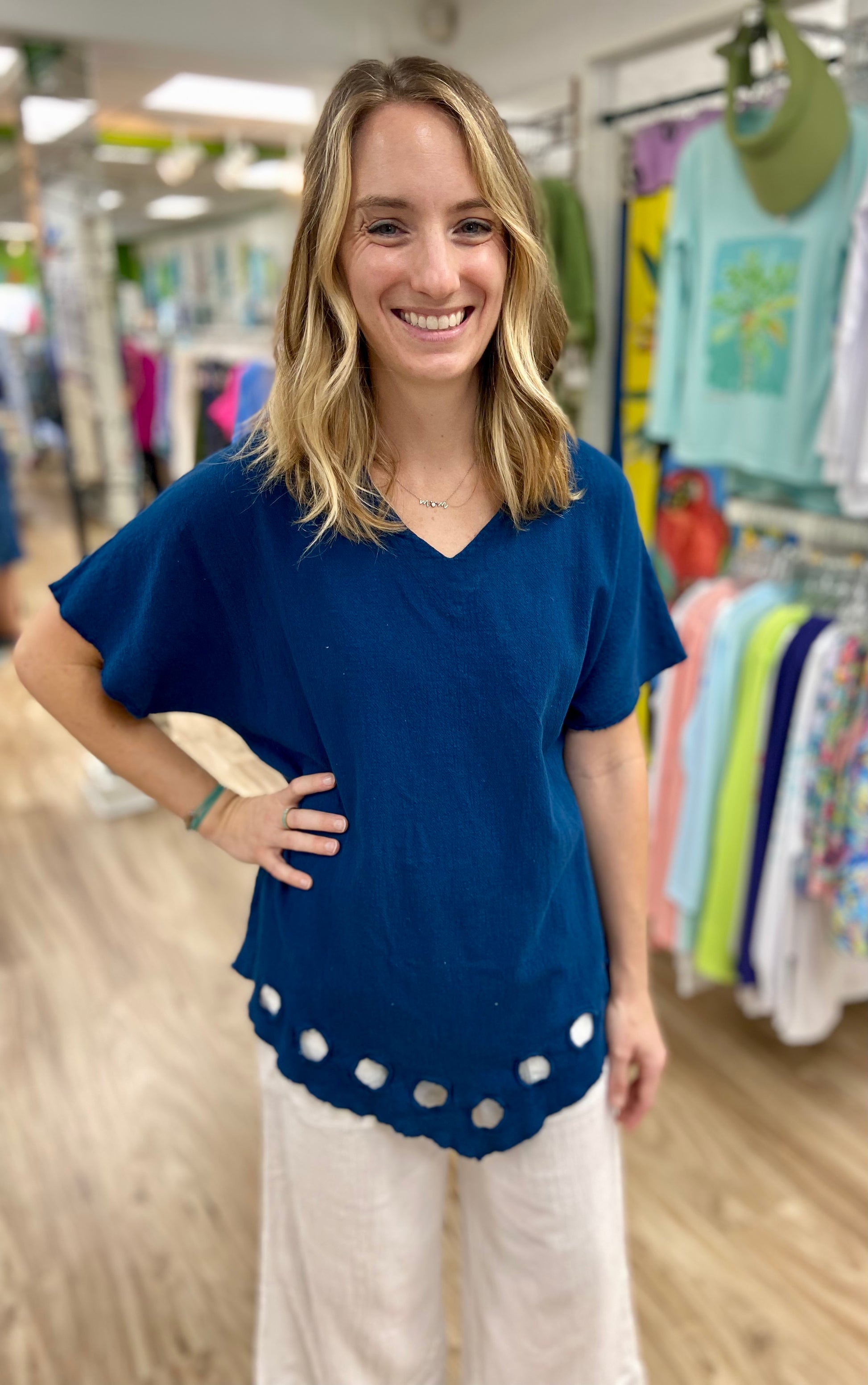 These pointed-hem top features circle cut-outs around the bottom for added fun & style!