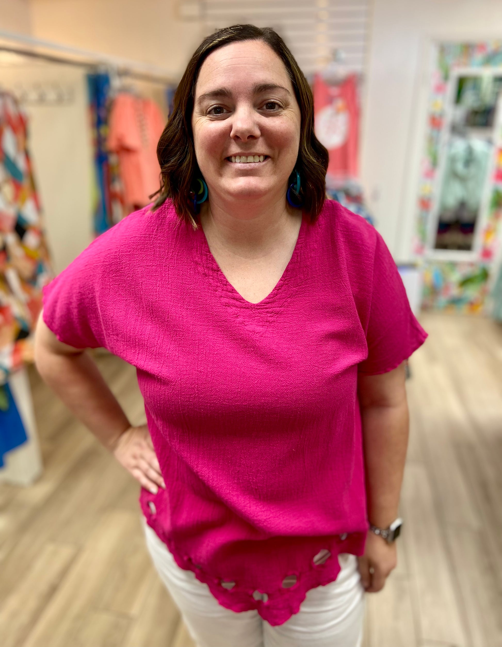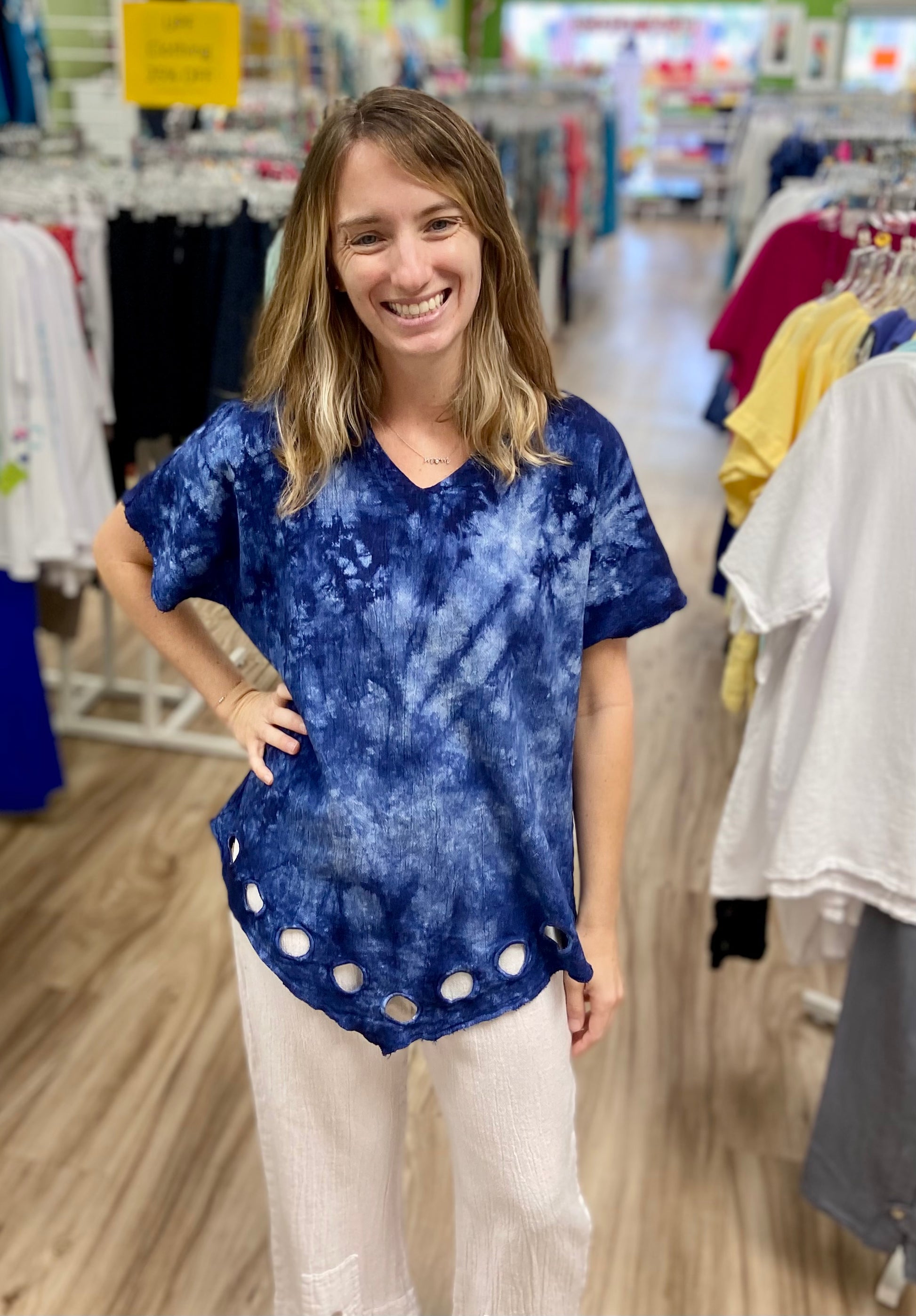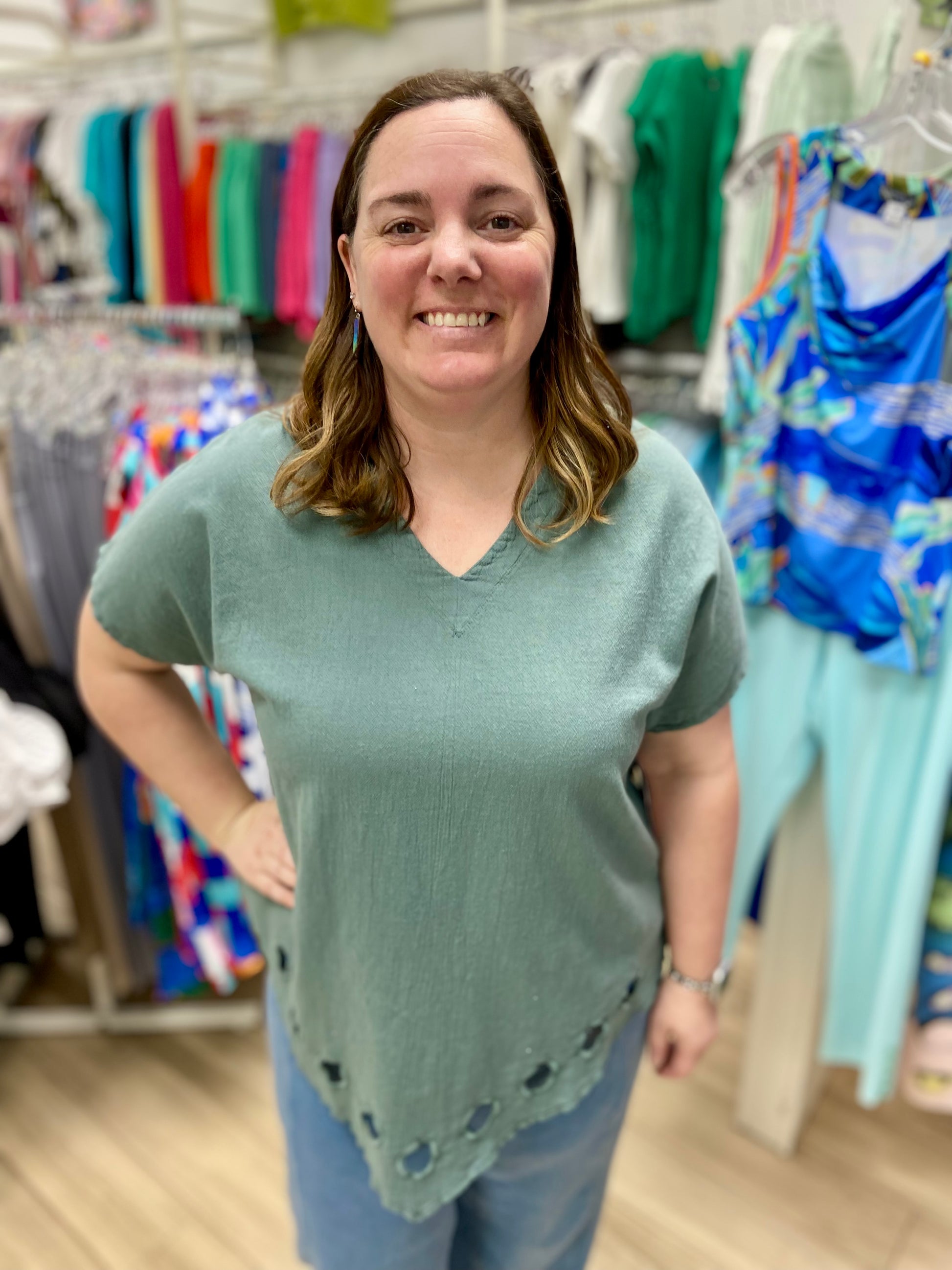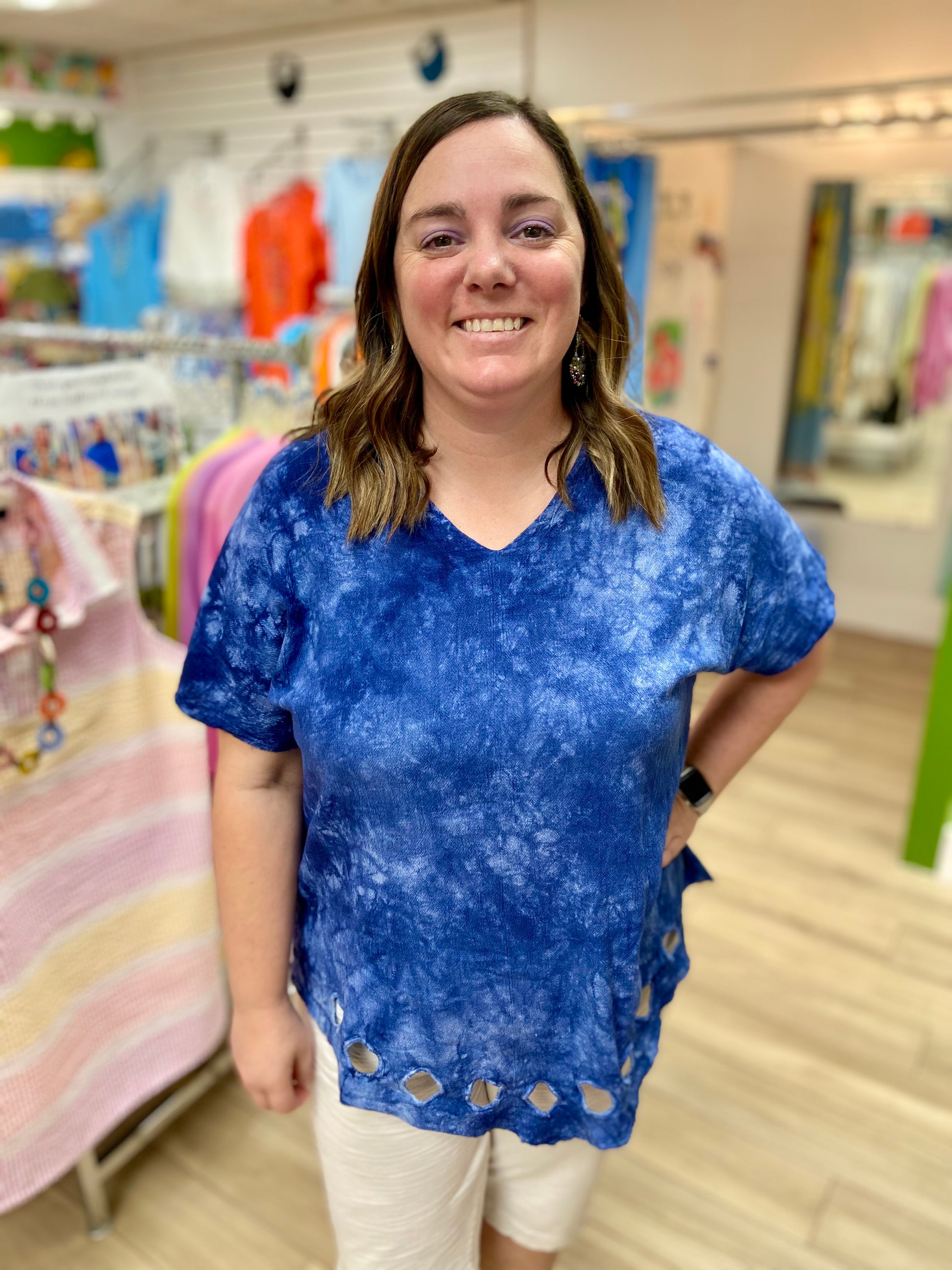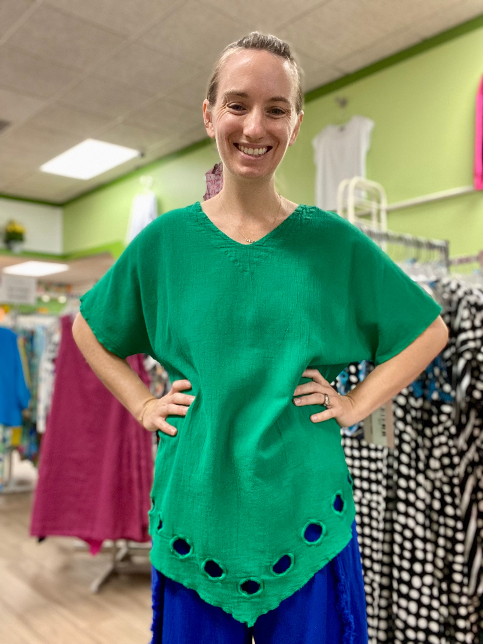 These pointed-hem top features circle cut-outs around the bottom for added fun & style!