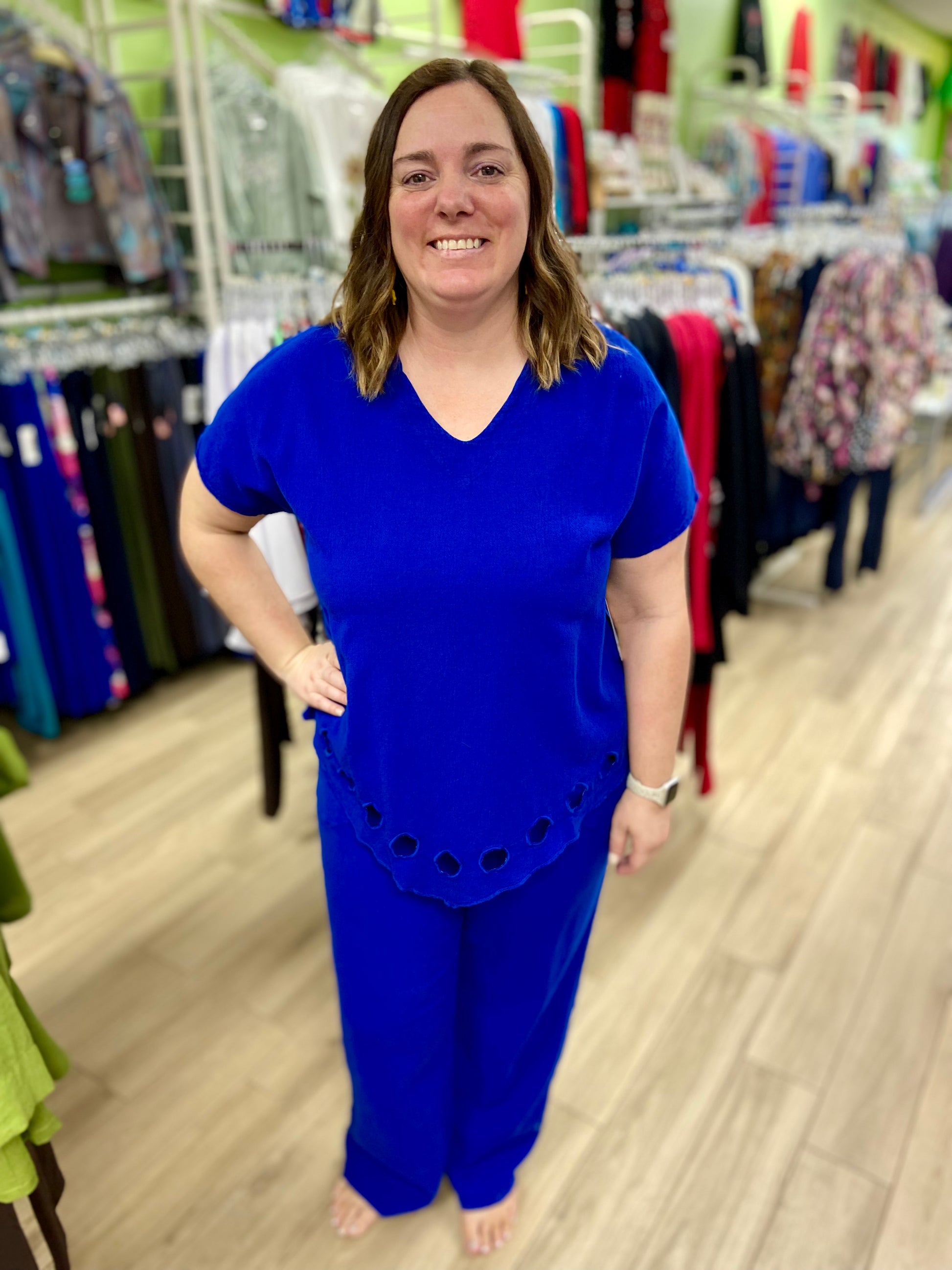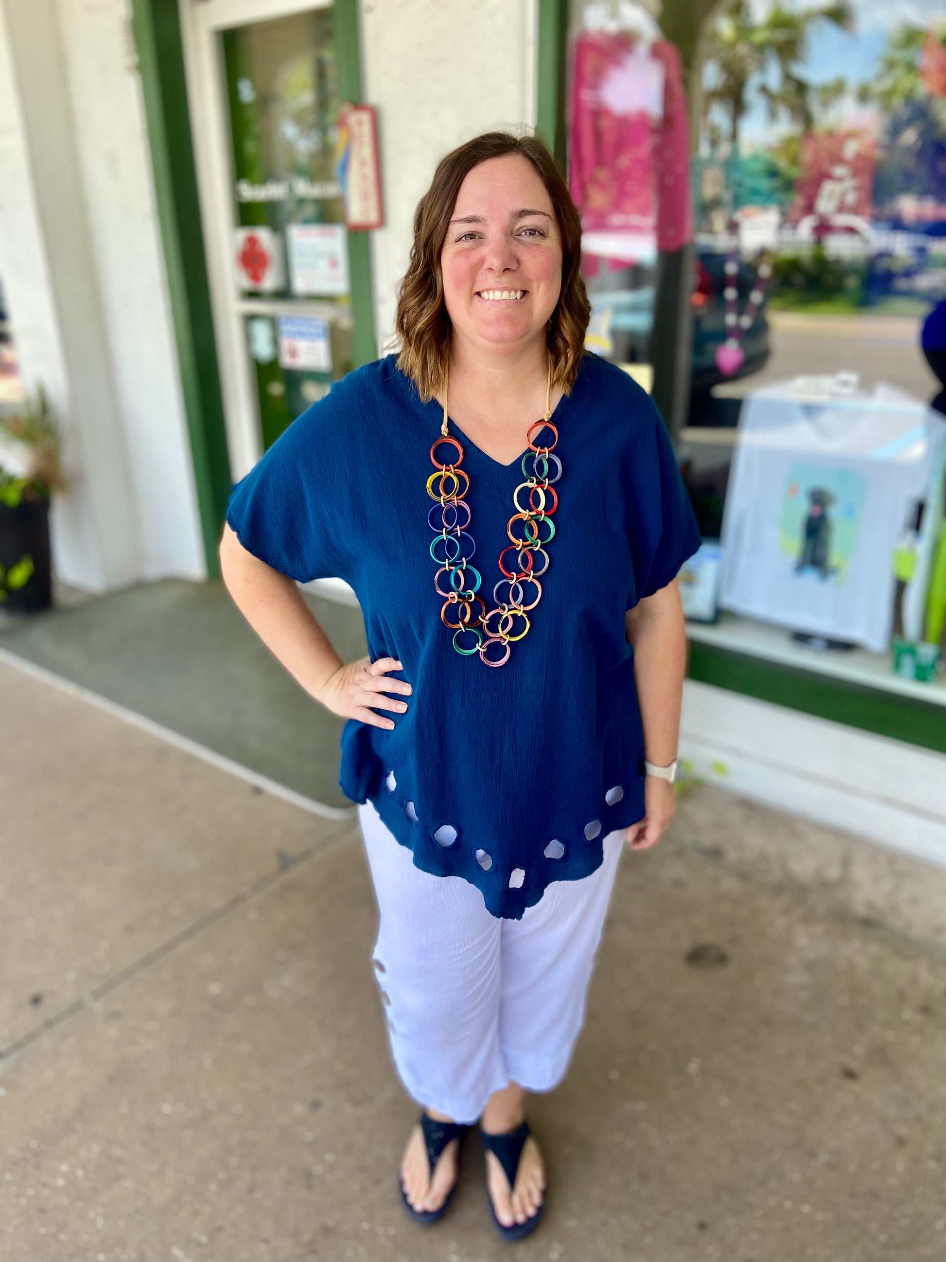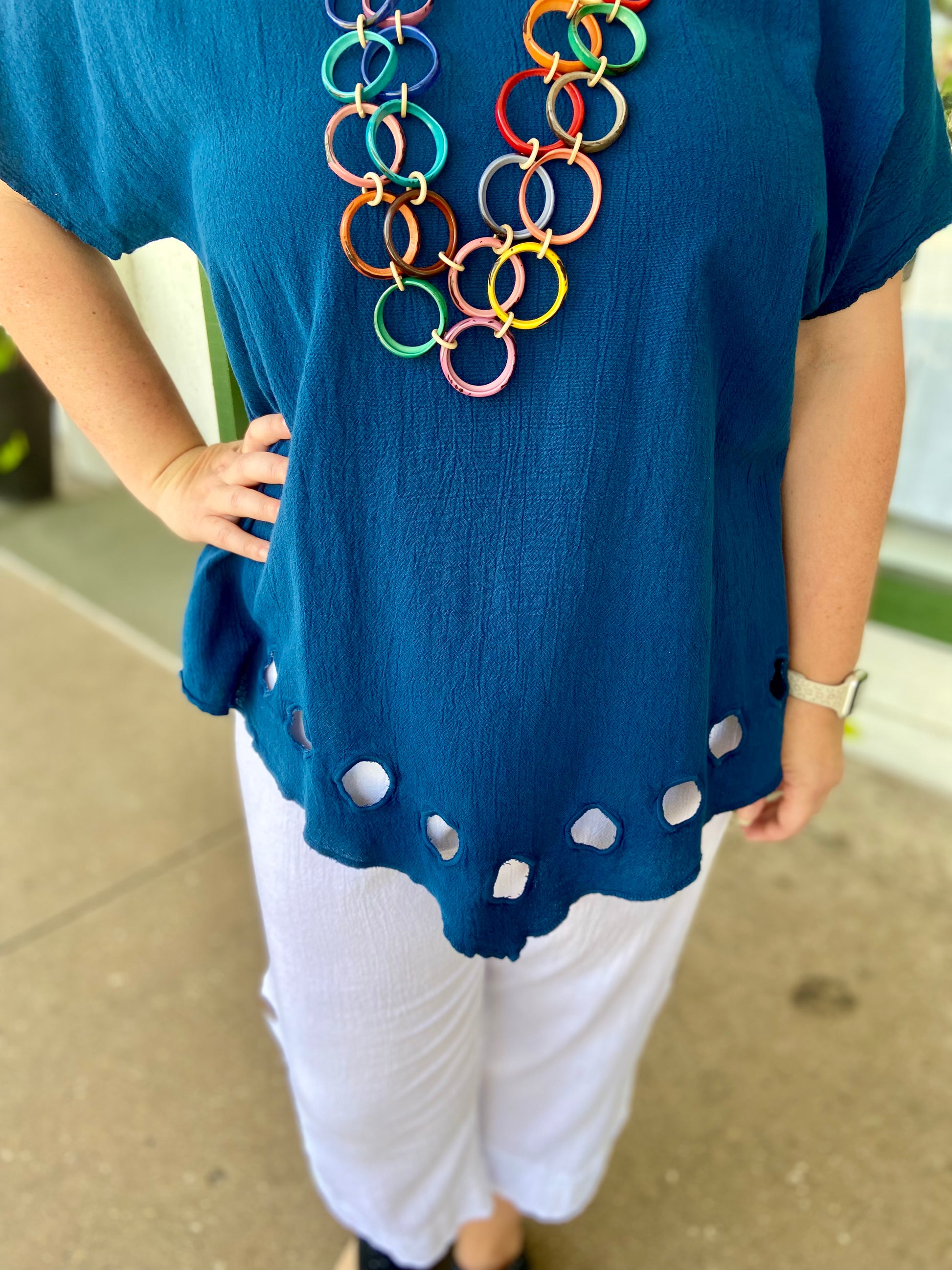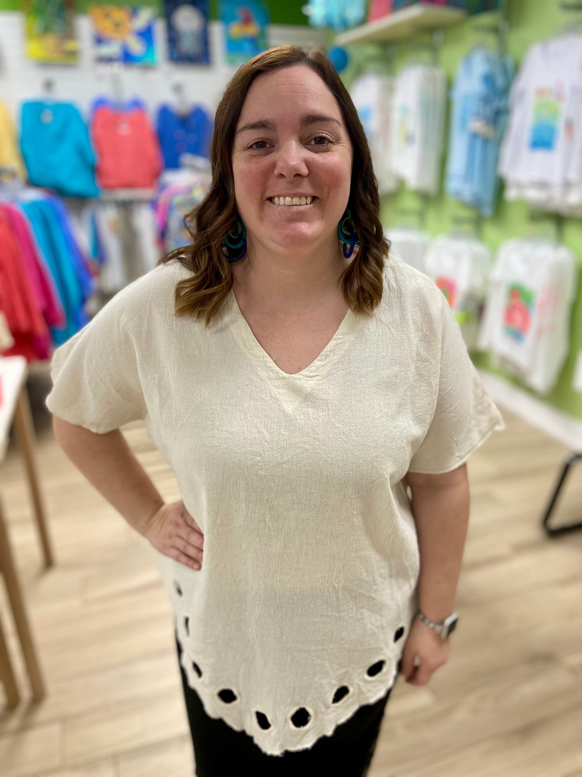 These pointed-hem top features circle cut-outs around the bottom for added fun & style!
