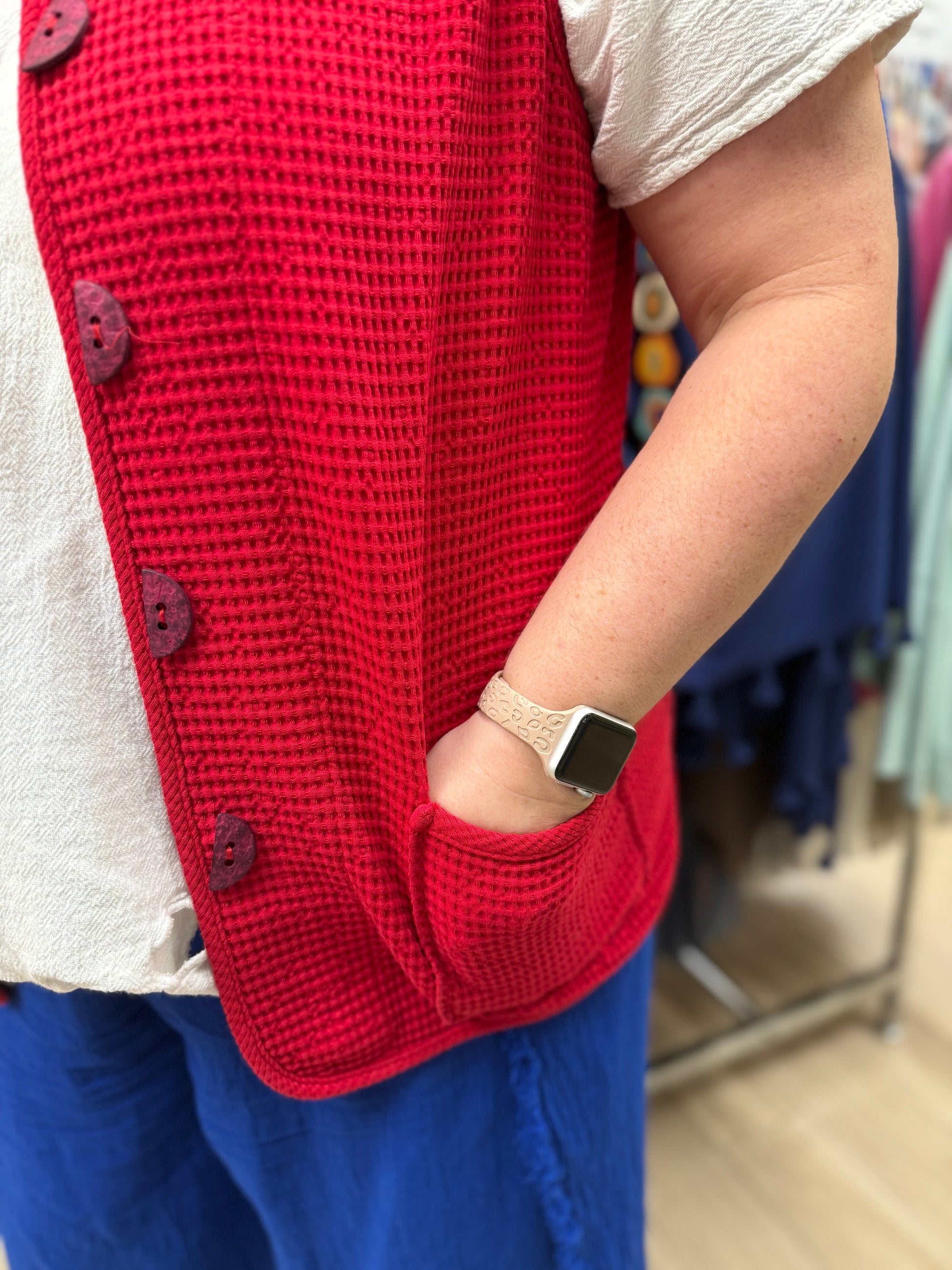 A fun vest in a wonderfully lightweight cotton waffle fabric - perfect for year-round wear!