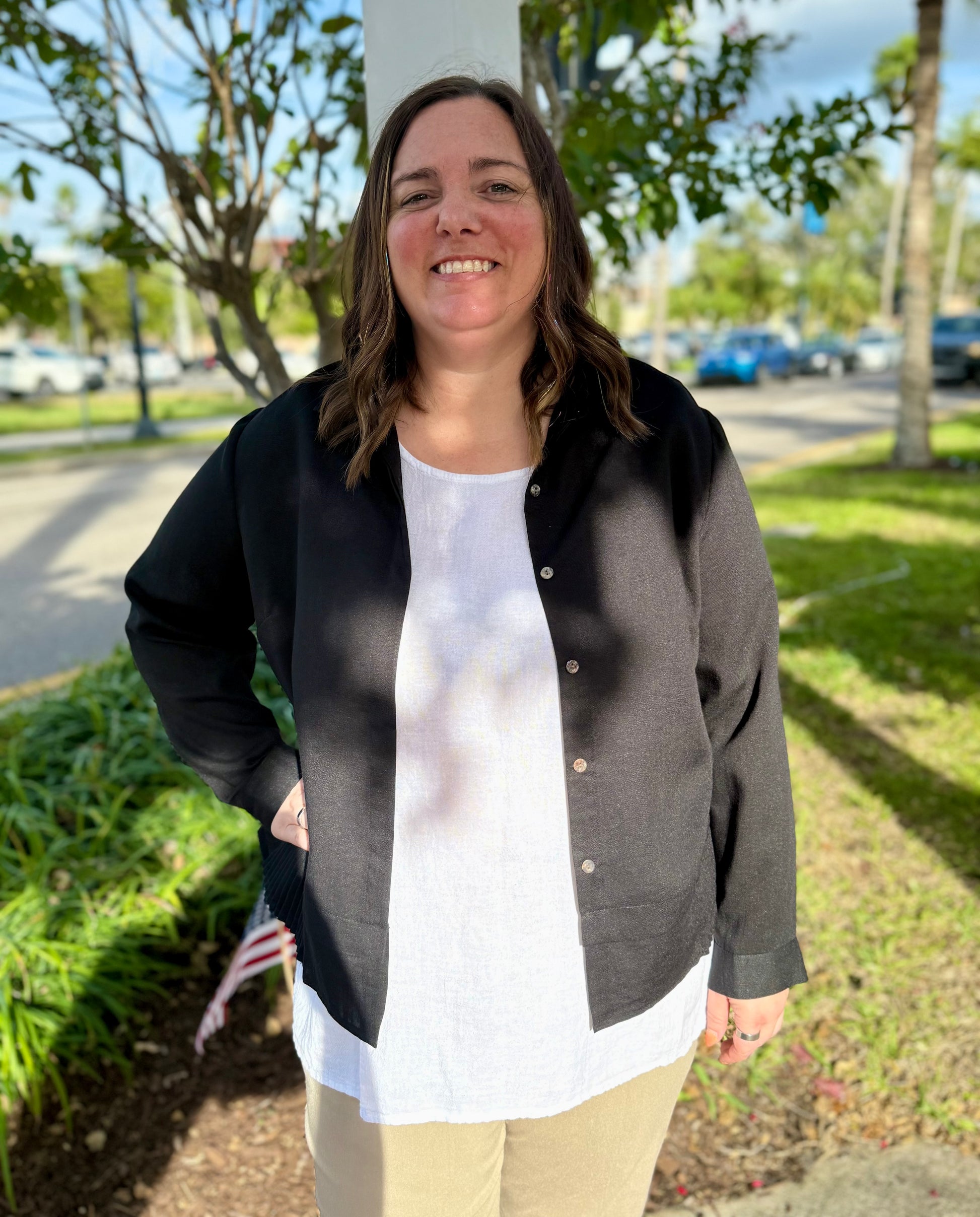 A great blouse with some fun at the hem! Best part? You never have to iron it!