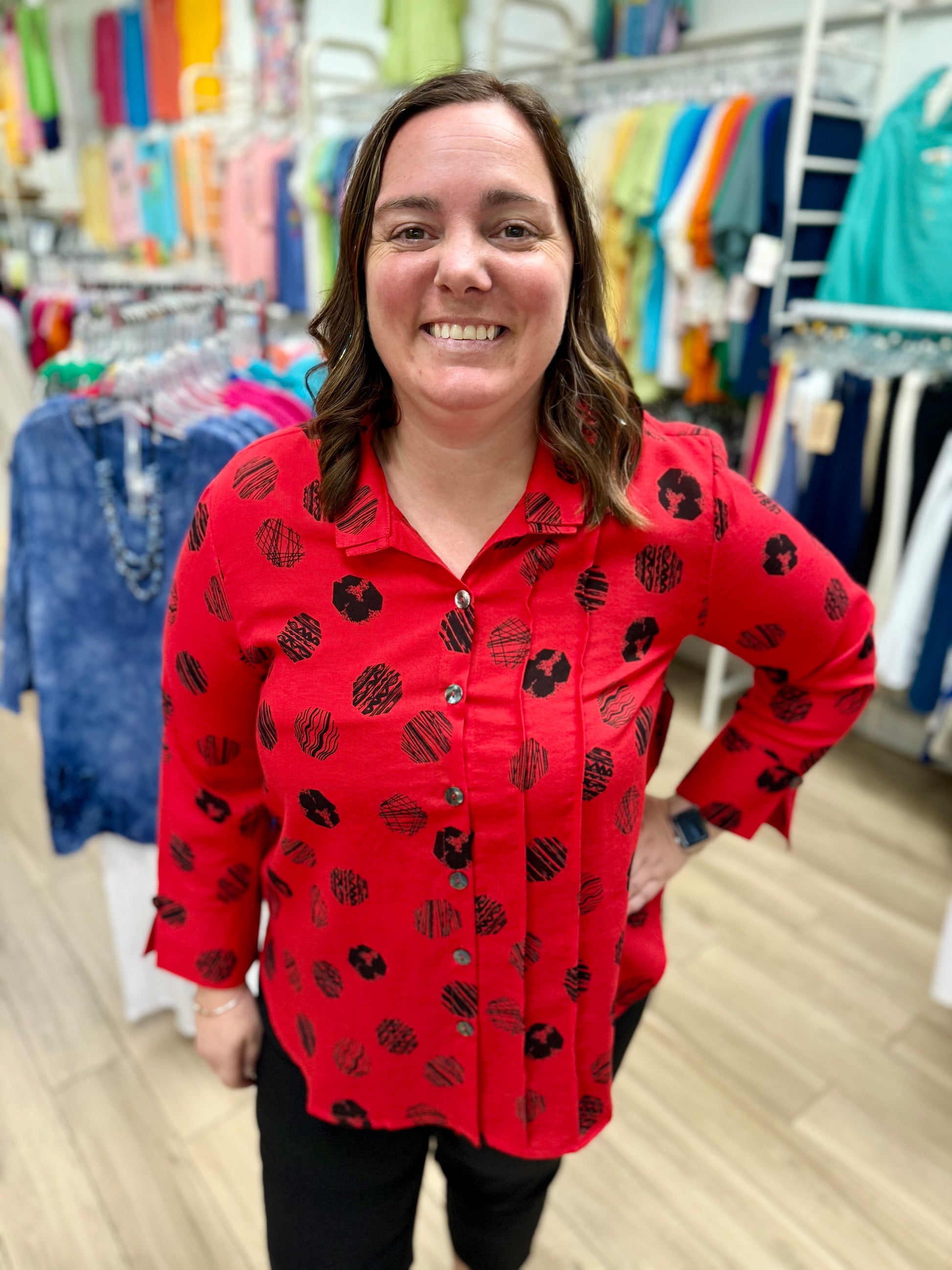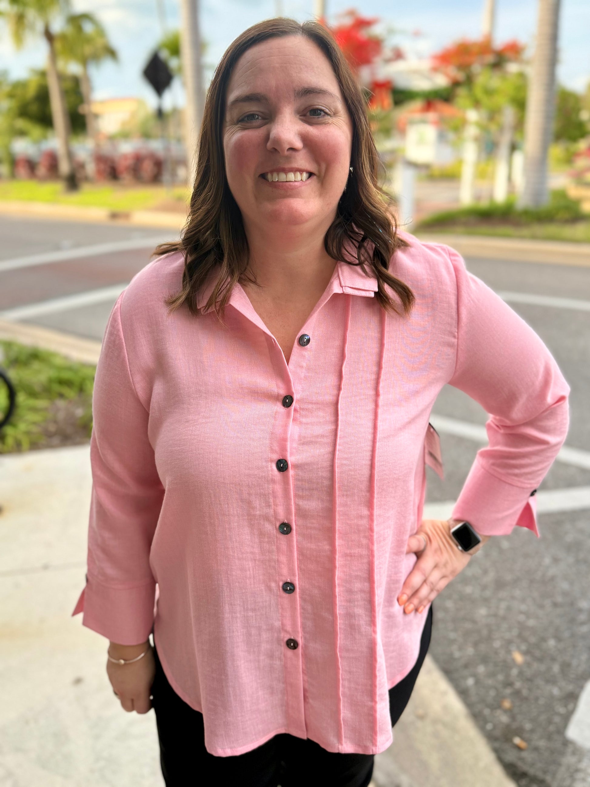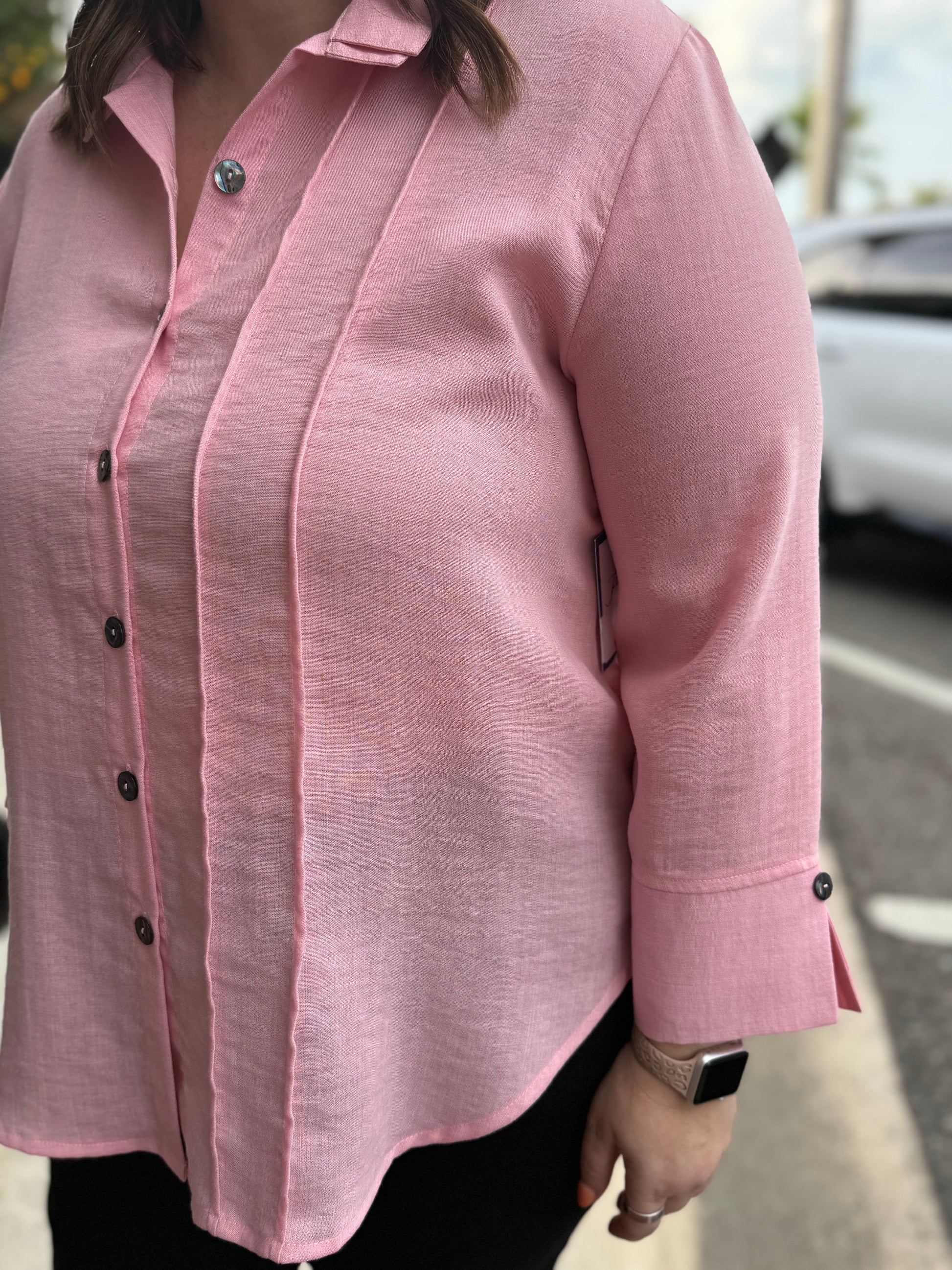 A fun side pleat detail makes this top something new and different! The no-iron fabric makes it classic!