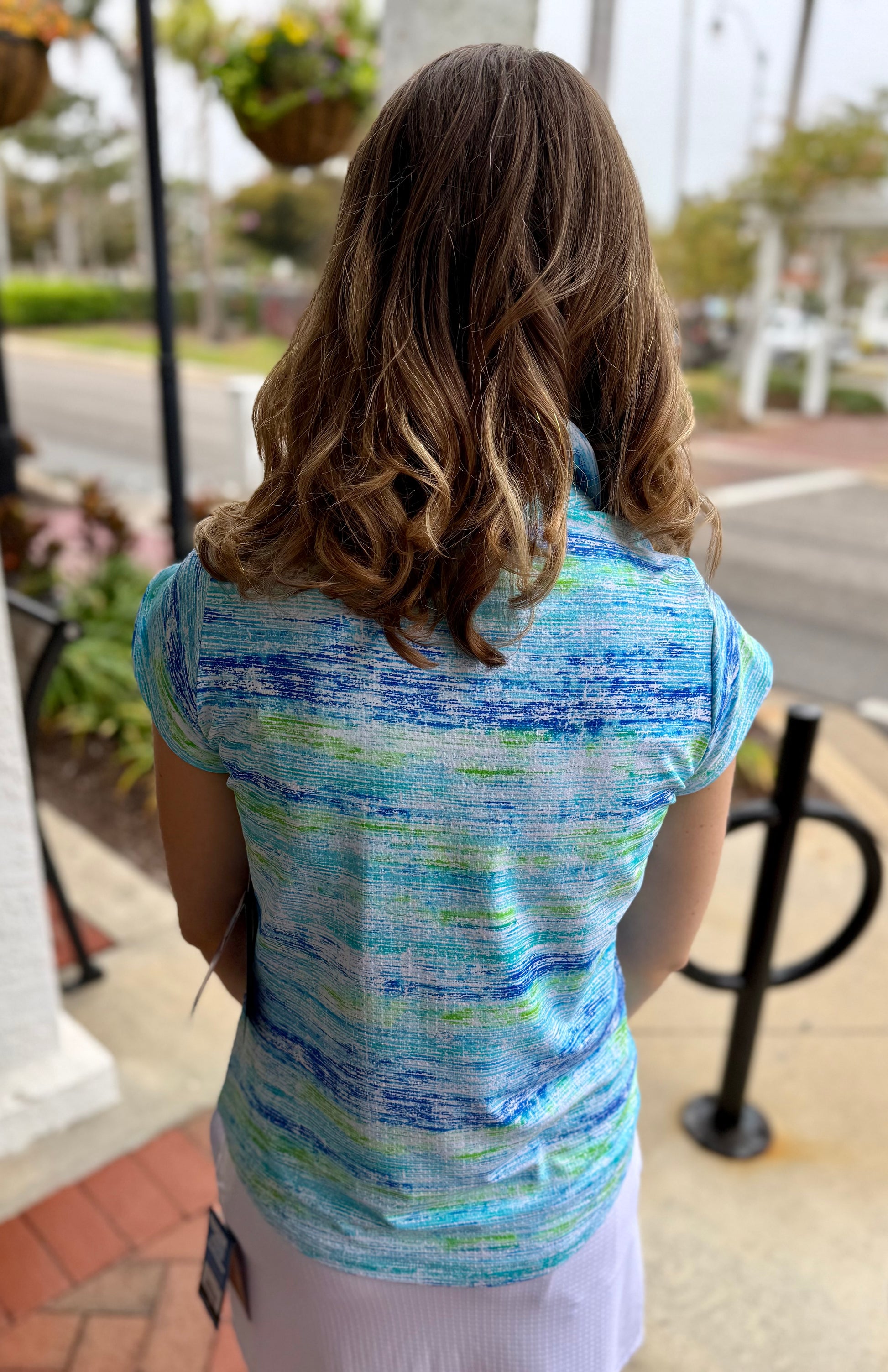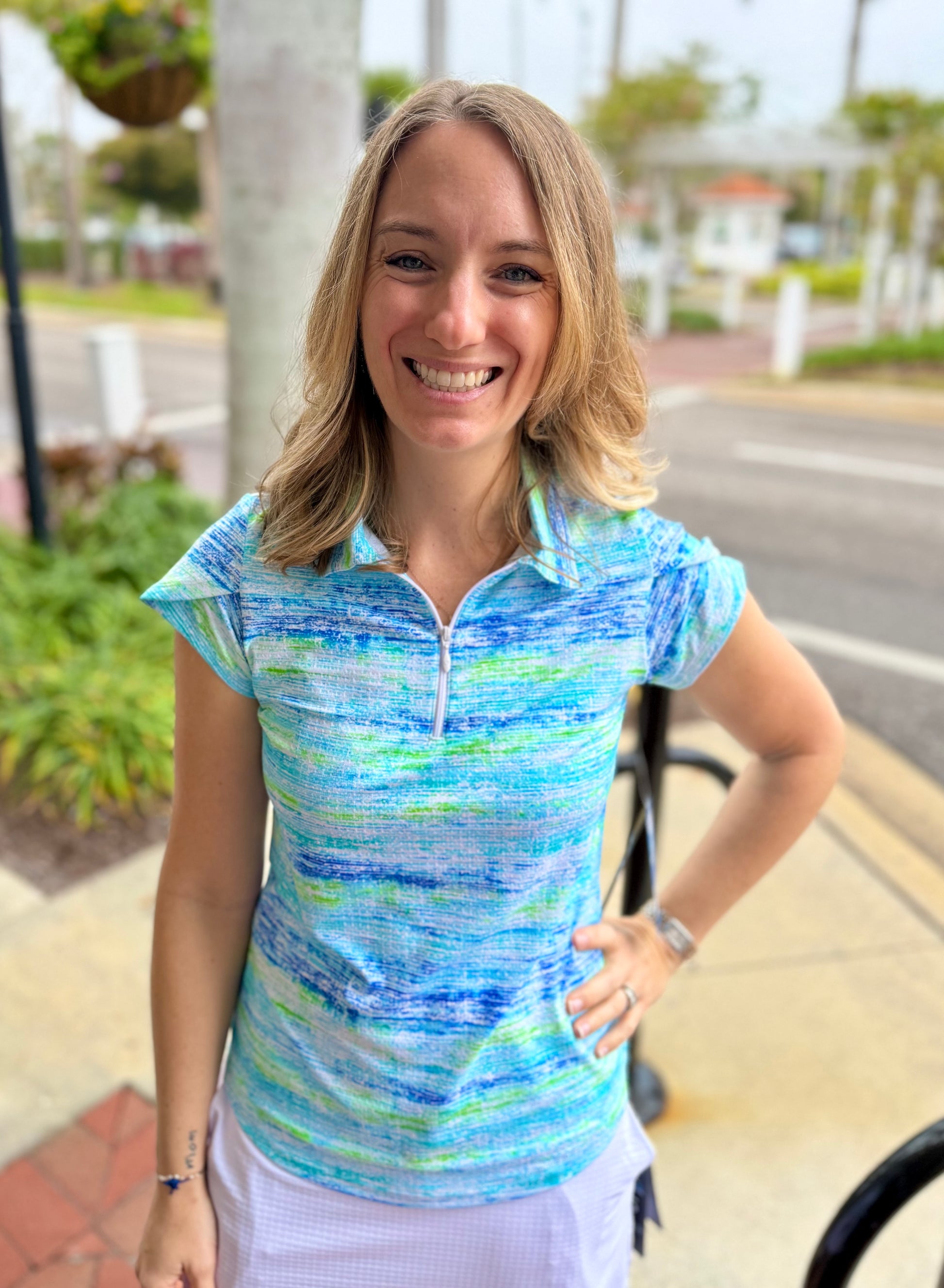A grat collared top with a fun sleeve detail. The collared neckline is perfect for the golf course, while the zip neck lets you bring in fresh air when you need it!