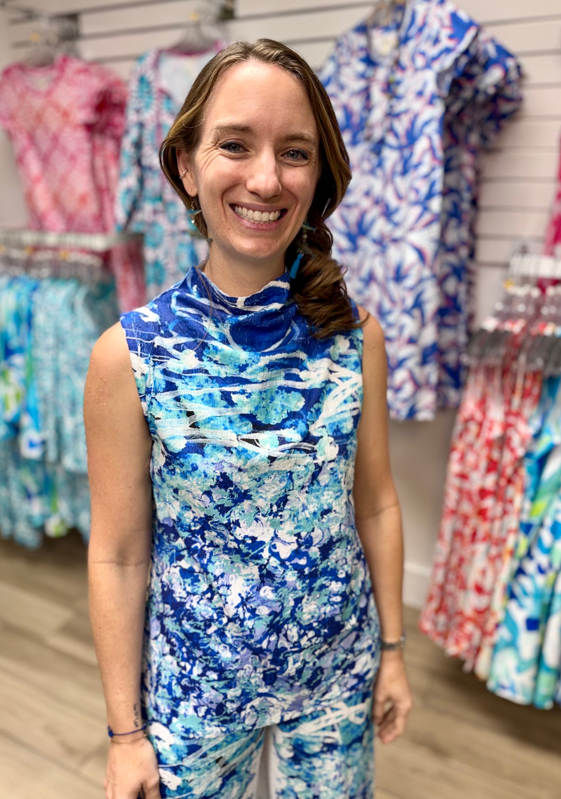 The details and colors of this top are bold and beautiful! The neckline flatters and the colors stun!