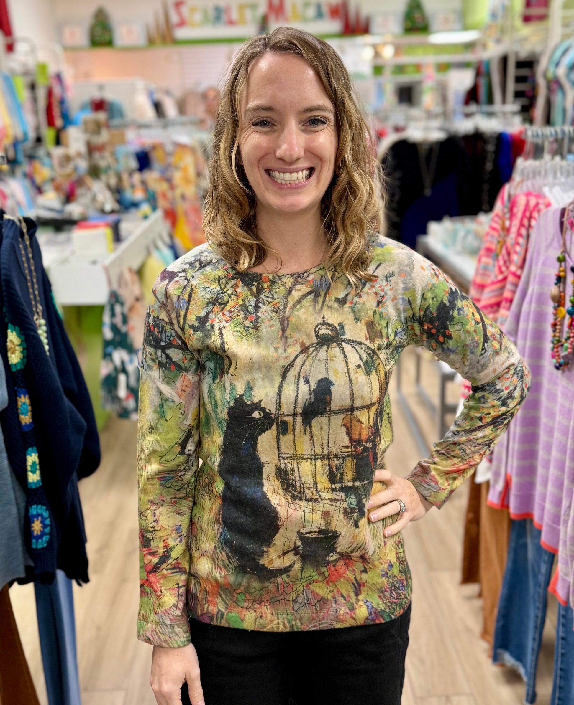 A fun and cozy cat top to bring a smile to your face!