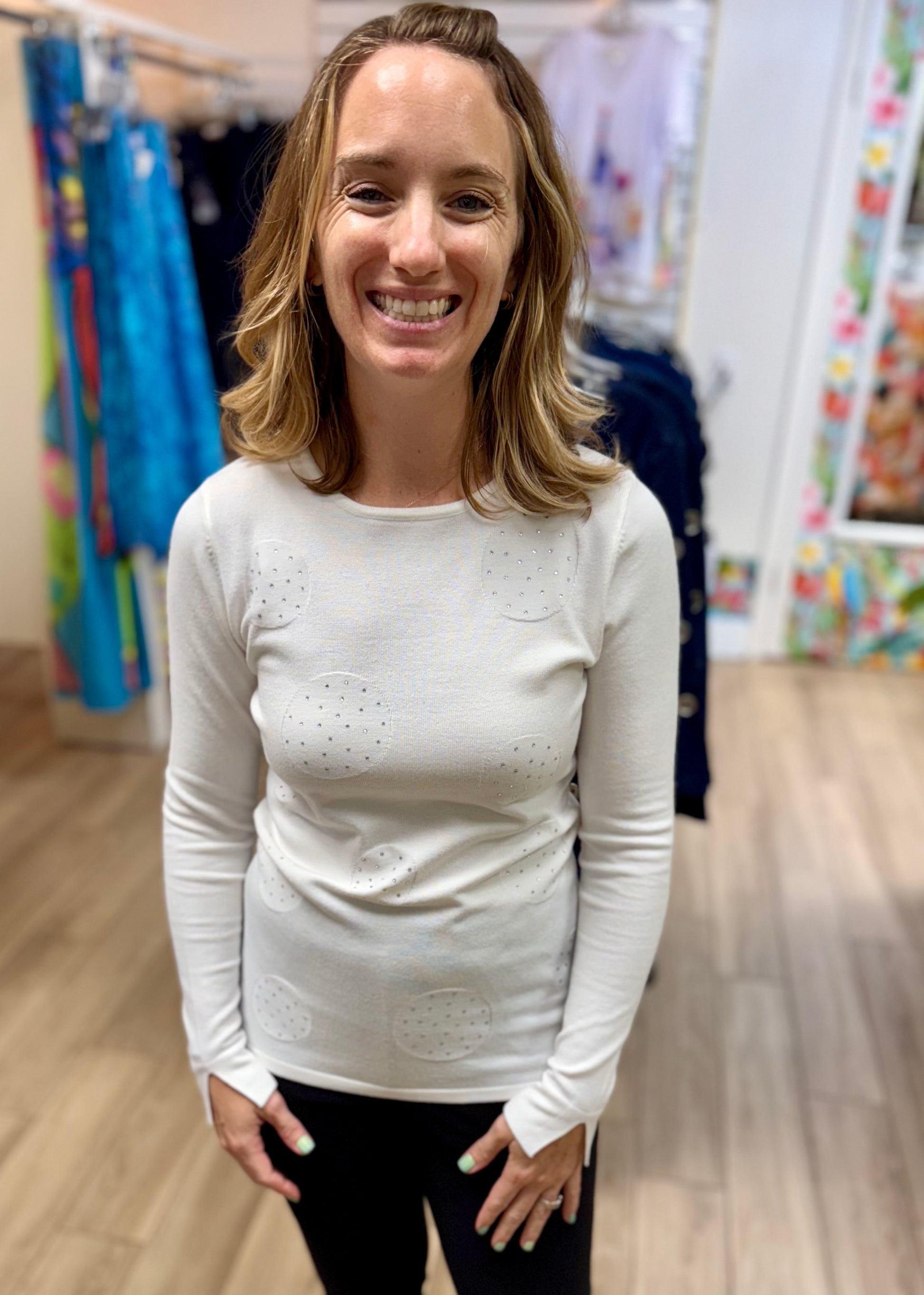 Stunning sparkle spots are sure to brighten any chilly day in this great lightweight sweater!