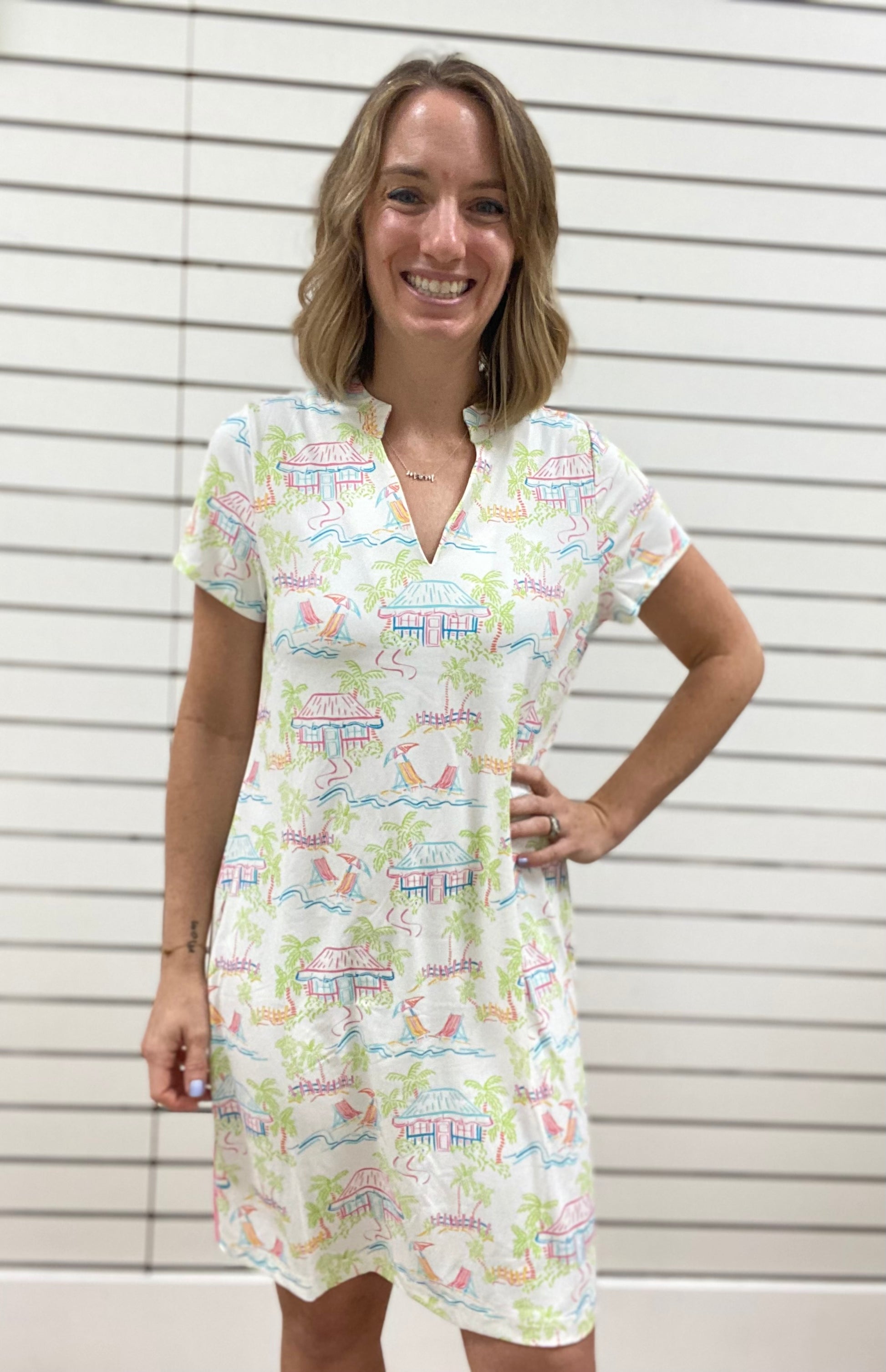 Style and stretch with sun protection! This tropical print dress is a sure winner!