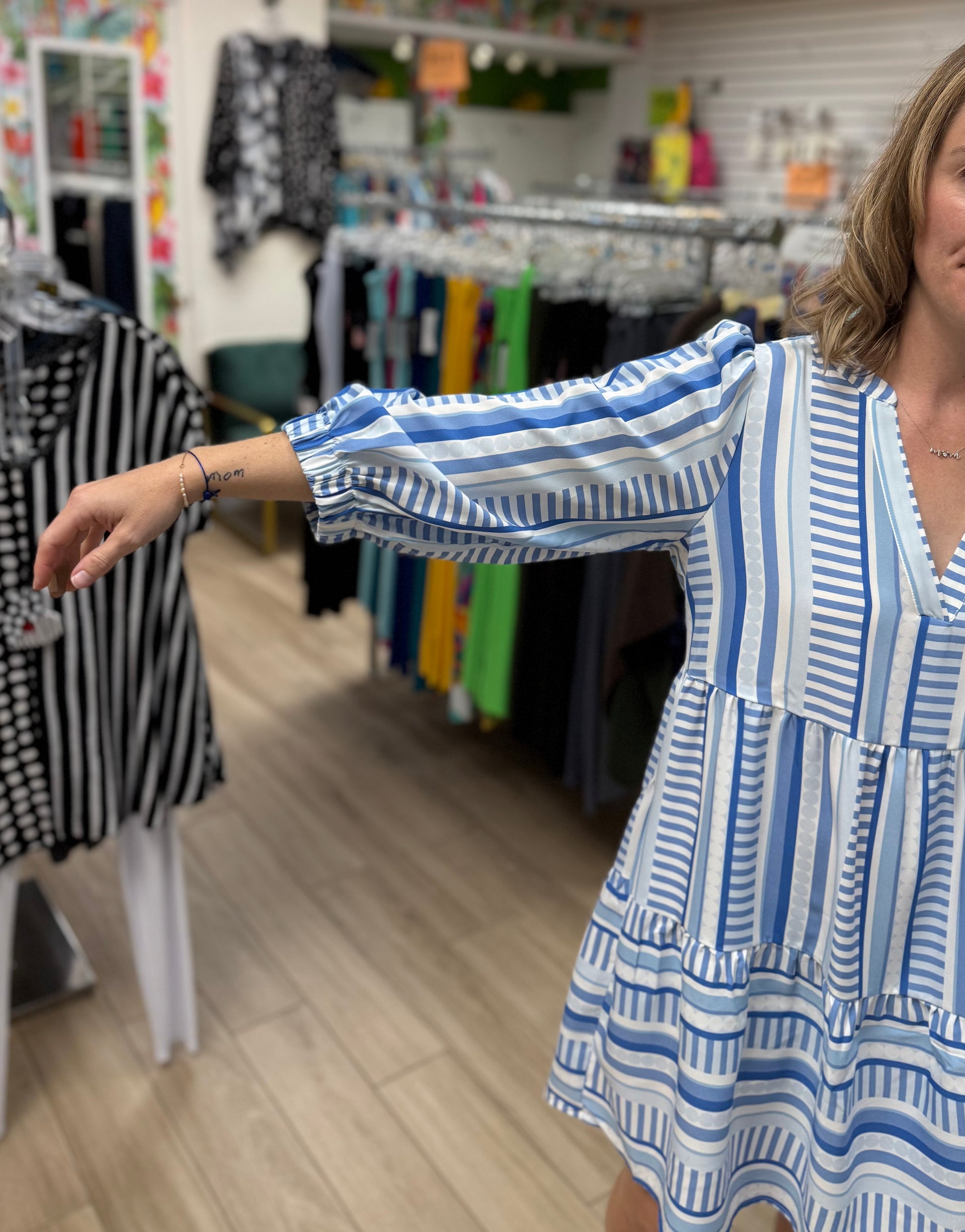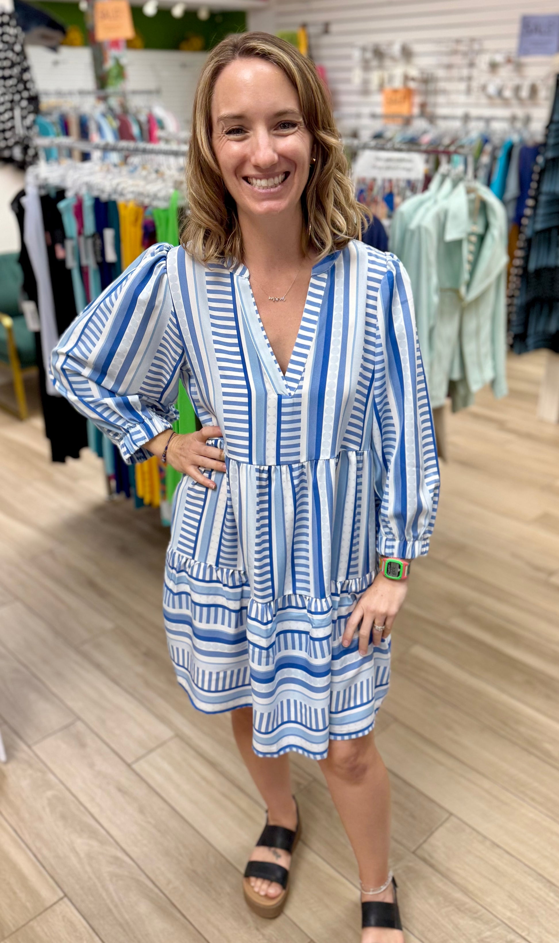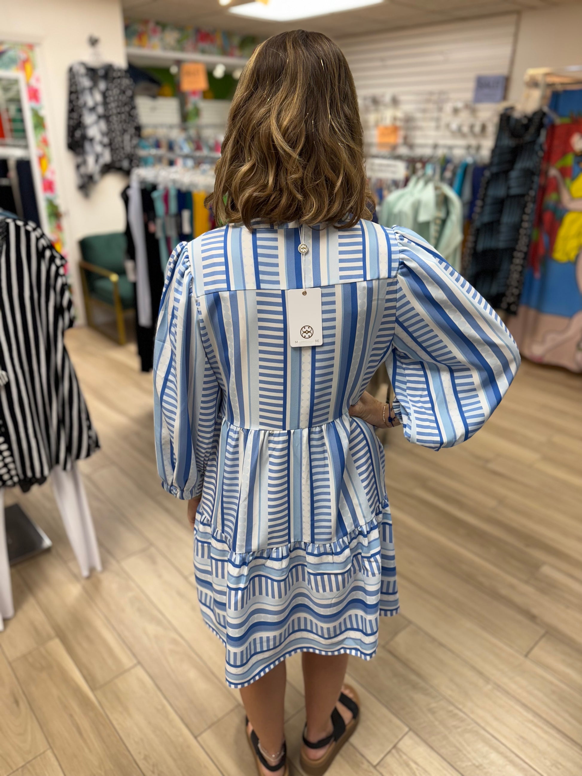 A gorgeous sea of blues to brighten any summer day. This dress is sure to make you smile!