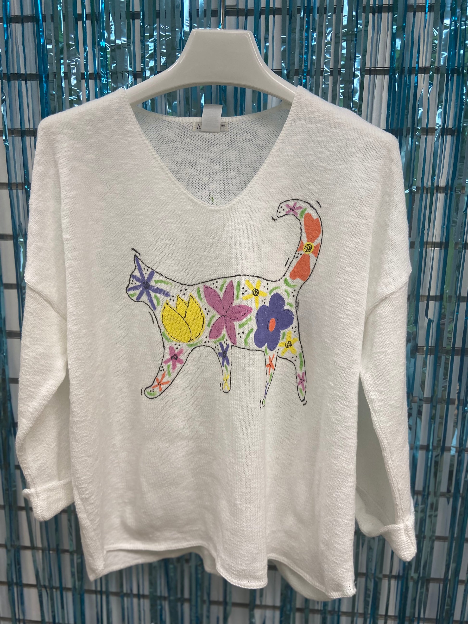 Cats are curious creatures - explore with them in this cute hand-painted sweater. There is even matching artwork on the back!