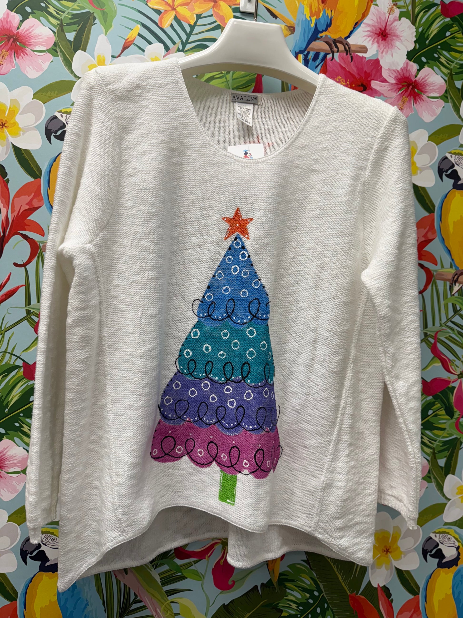 A fun and artsy tree graces the front of this fun winter sweater! Matching painted stars add a fun touch to the back too!