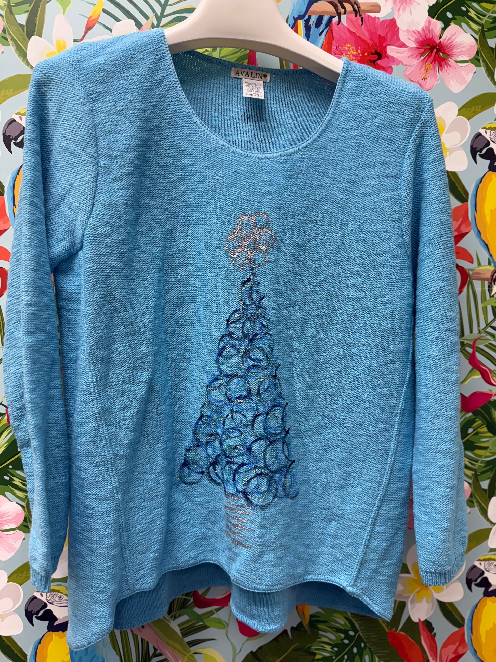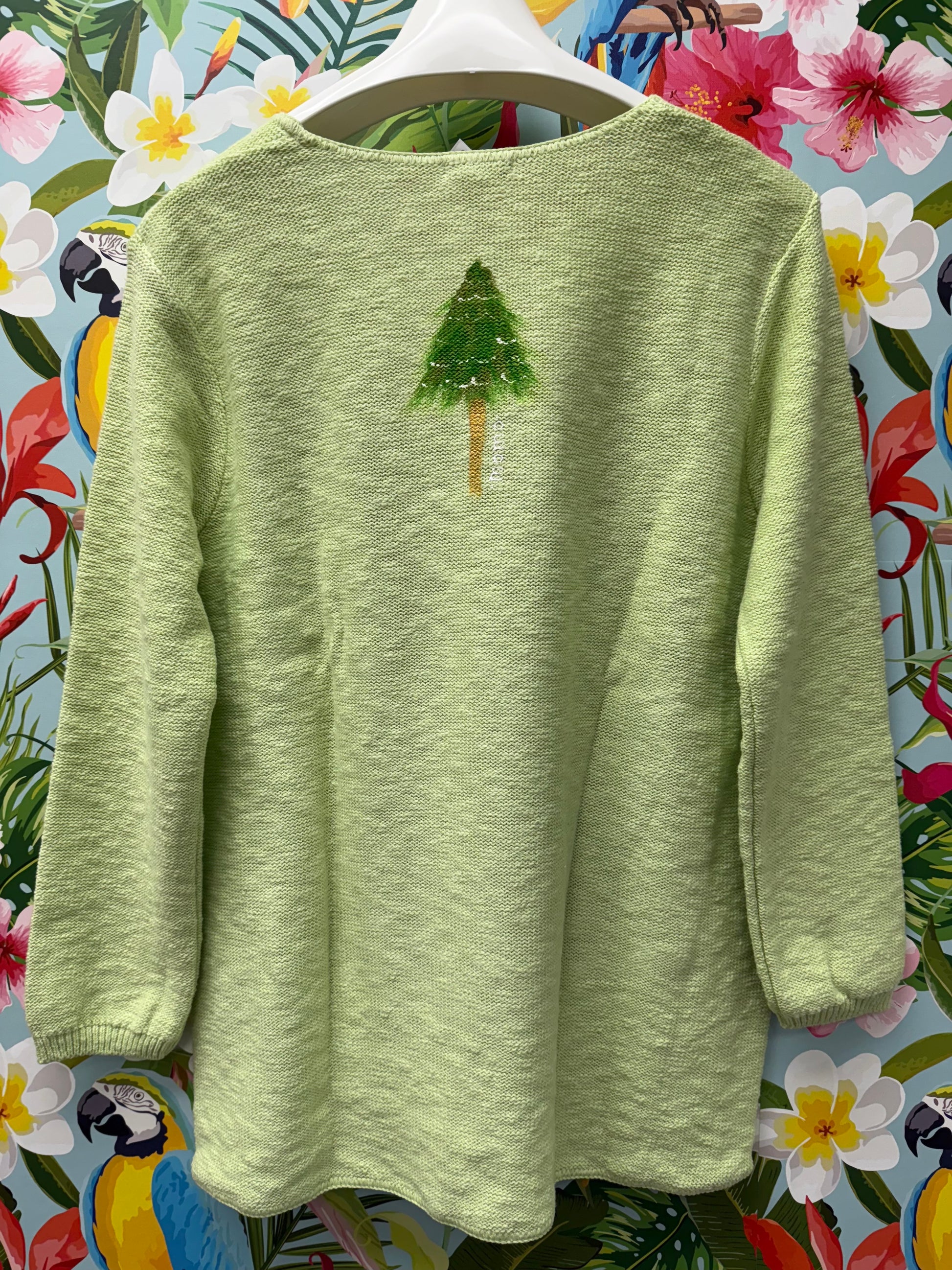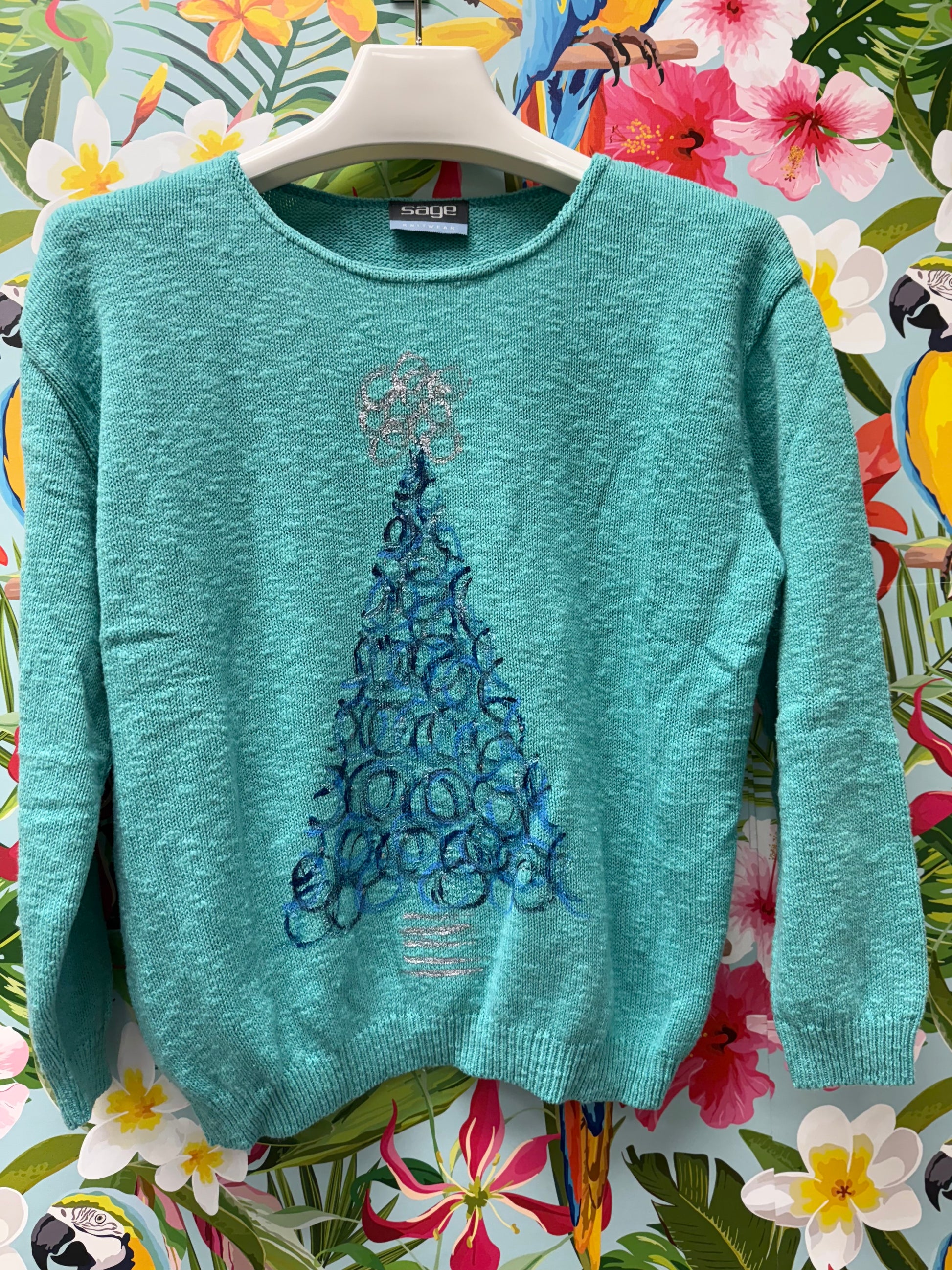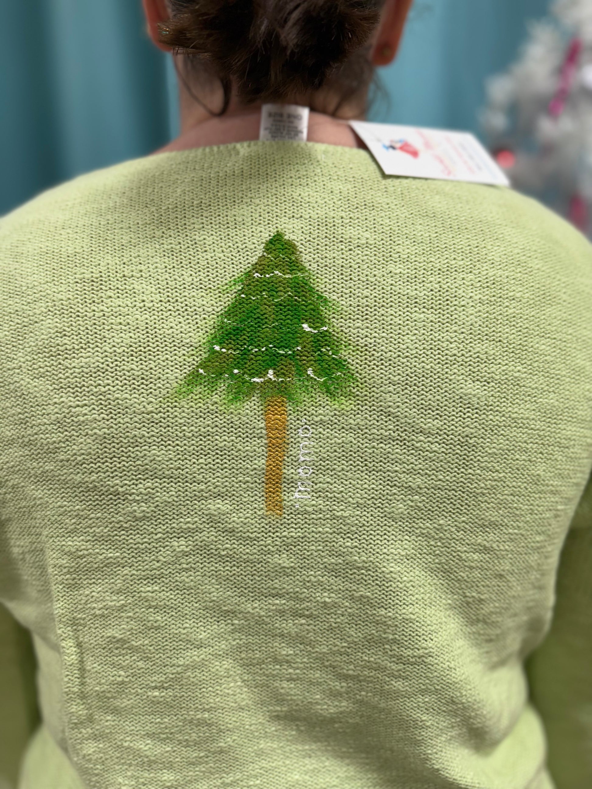 A gorgeous and artsy tree graces the front and back of this fun winter sweater!