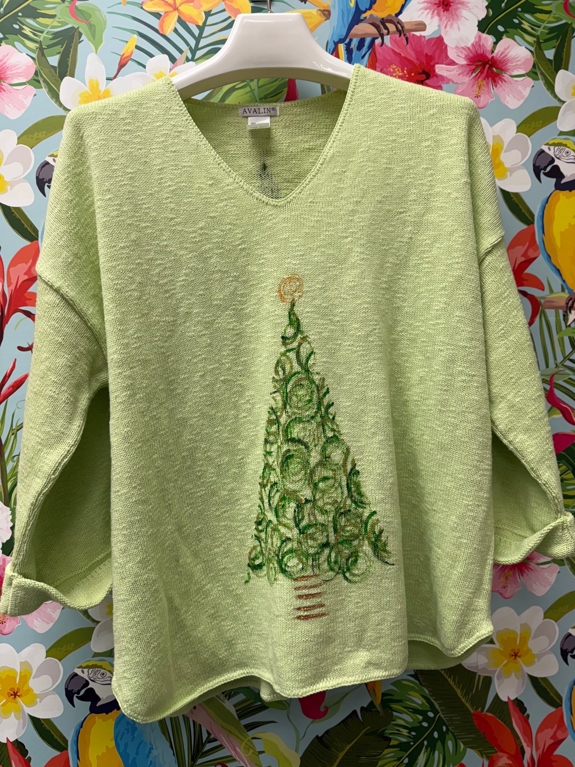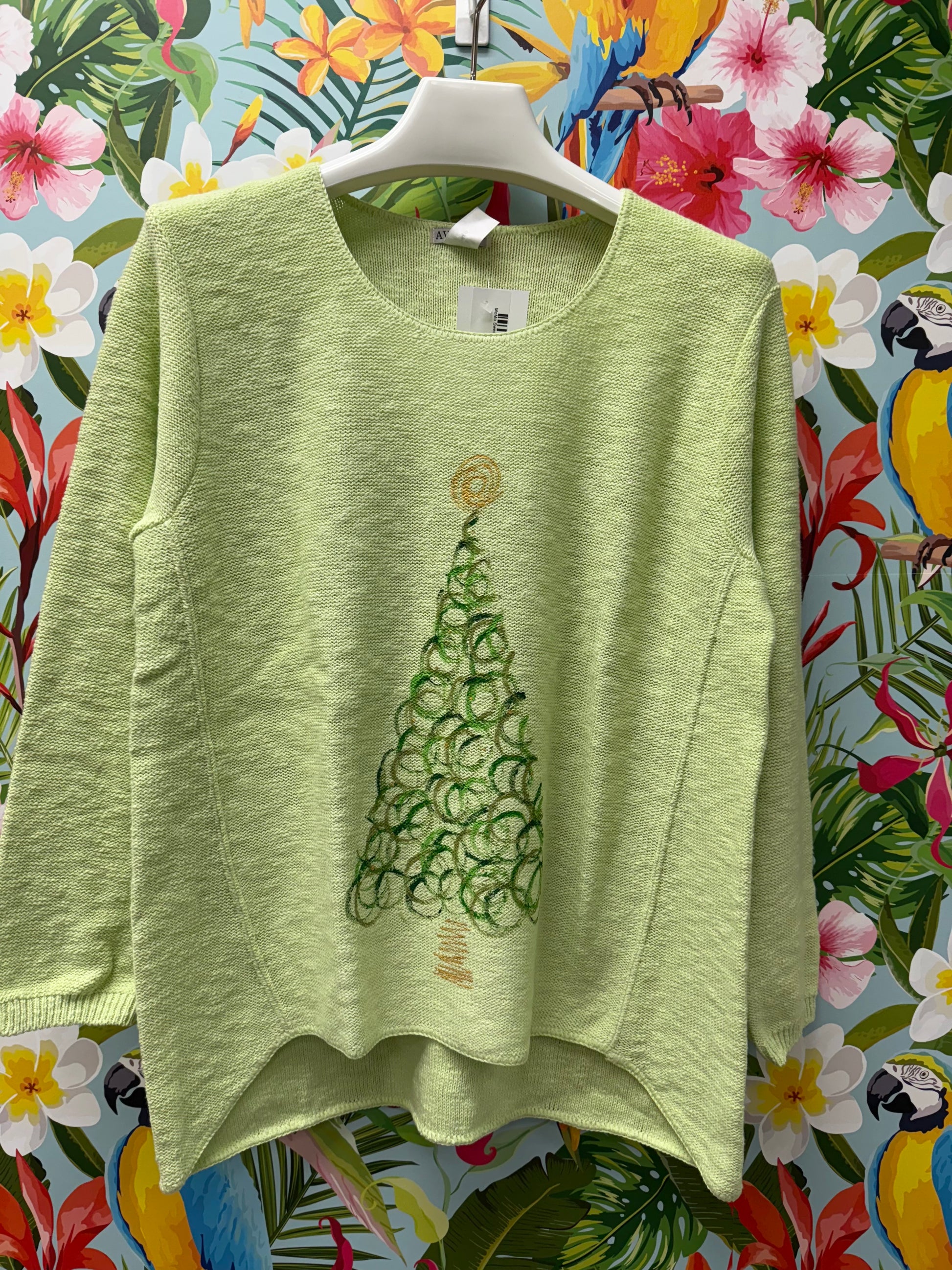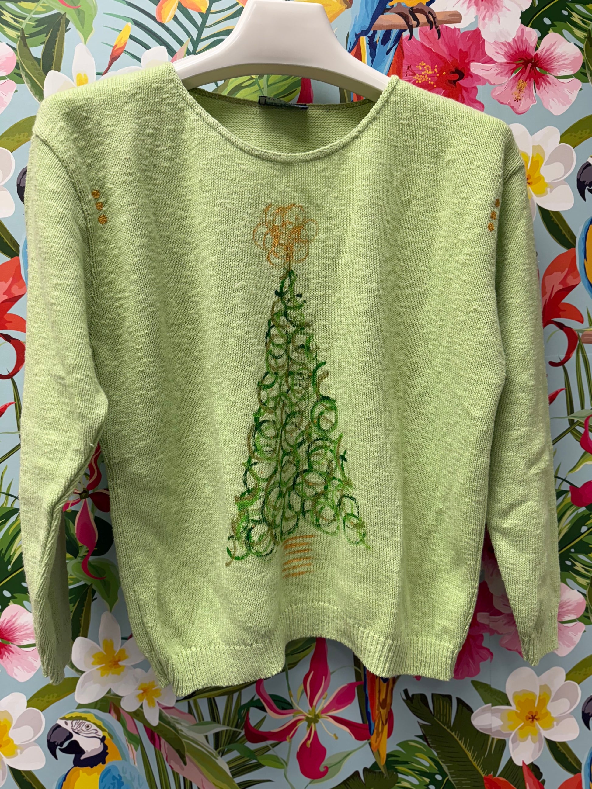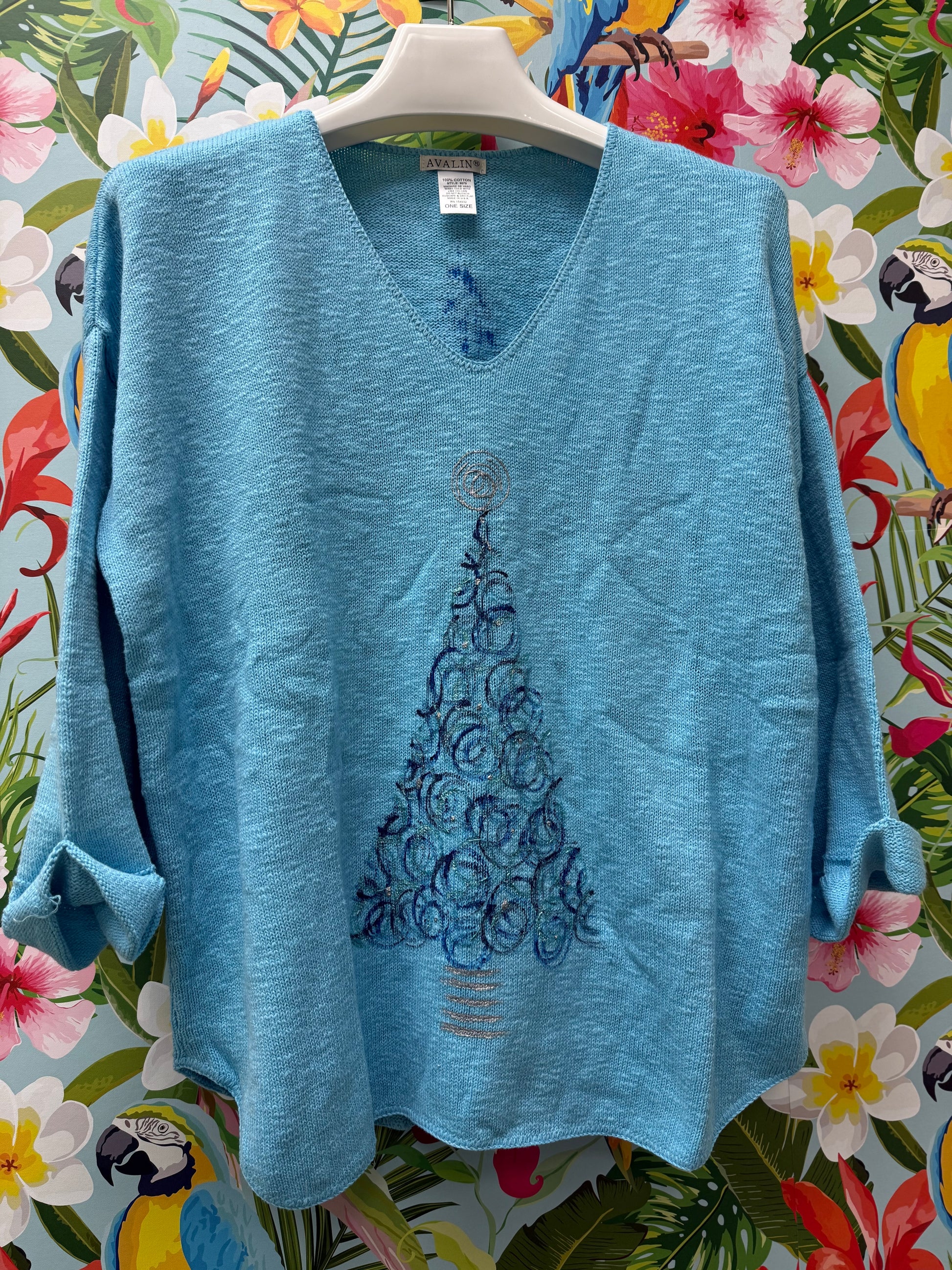 A gorgeous and artsy tree graces the front and back of this fun winter sweater!