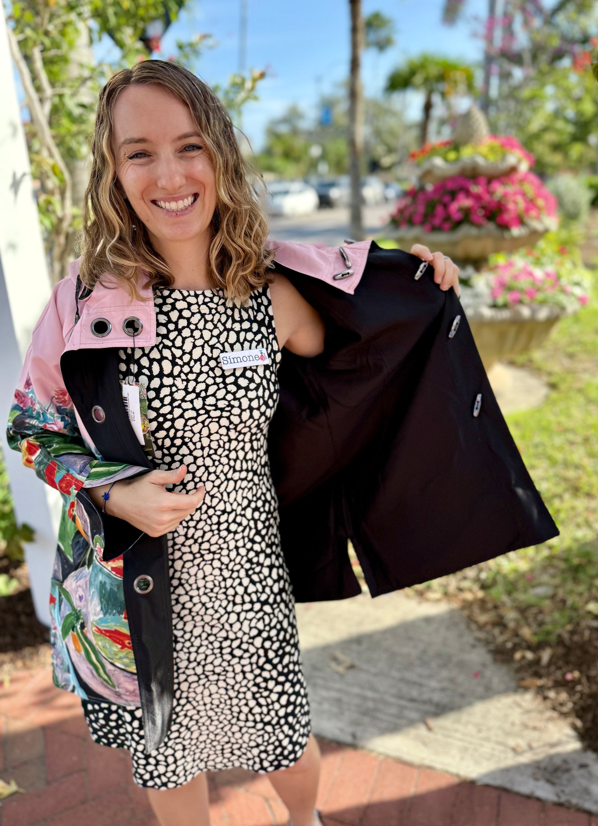 Soft yet stunning artwork covers this reversible rain jacket! You are sure to fall in love with something so bright and cheery for a gloomy day.
