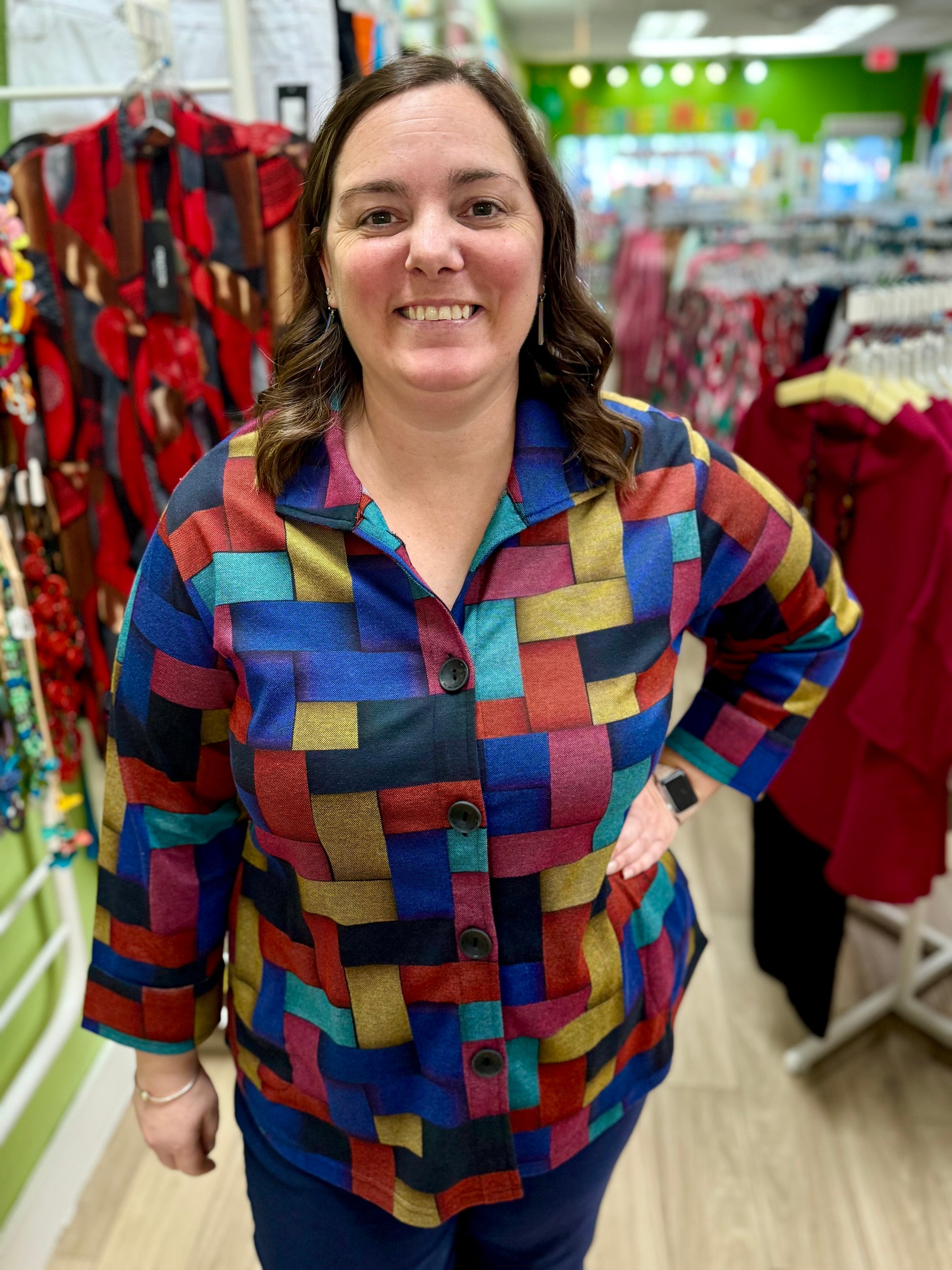A beautiful print blouse that almost looks hand-woven! This is sure to keep you colorful and cute on any occasion!