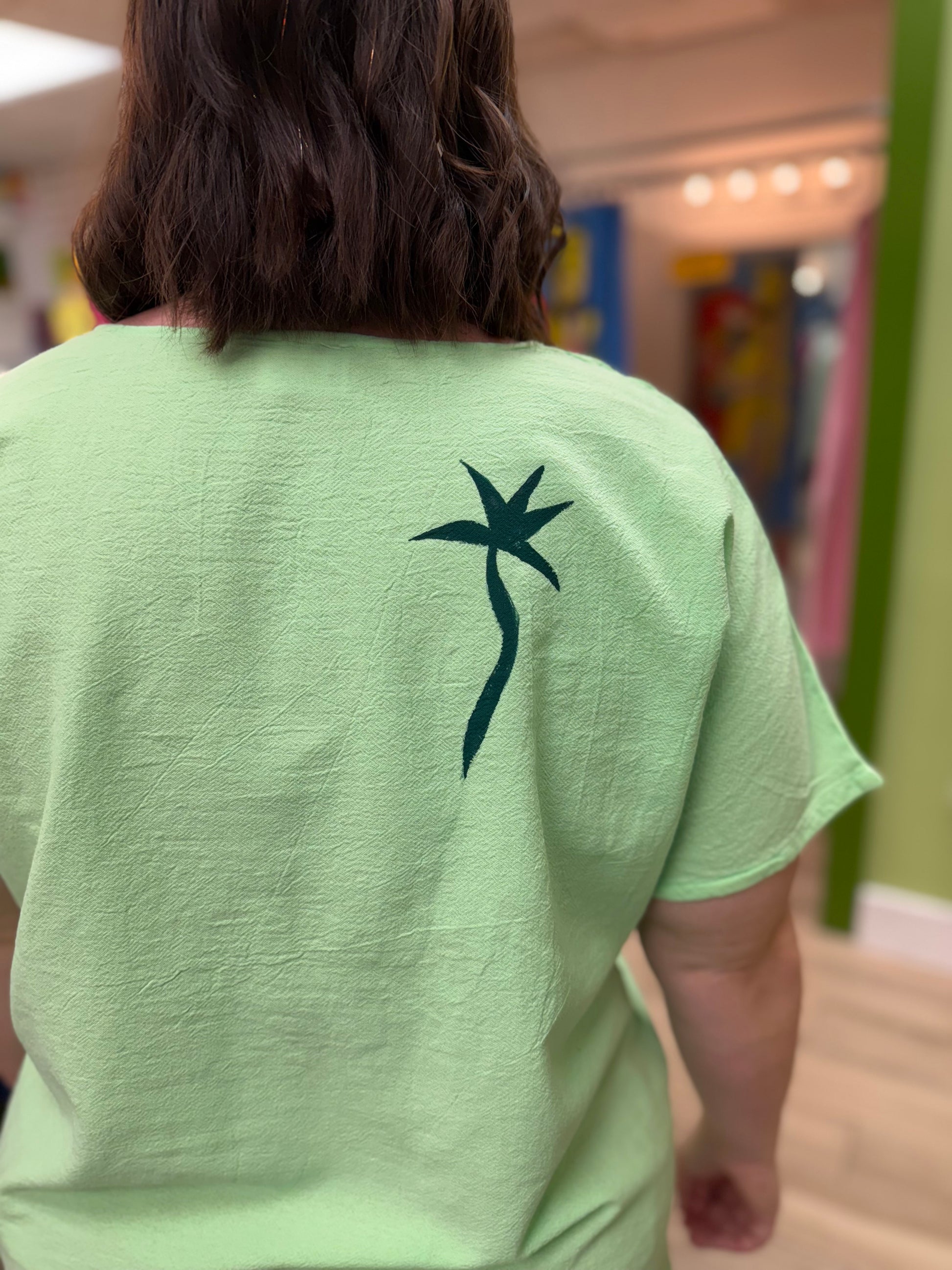Kick back and relax in this Cottonseed tee featuring a dolman sleeve. There is a matching palm tree on the back!