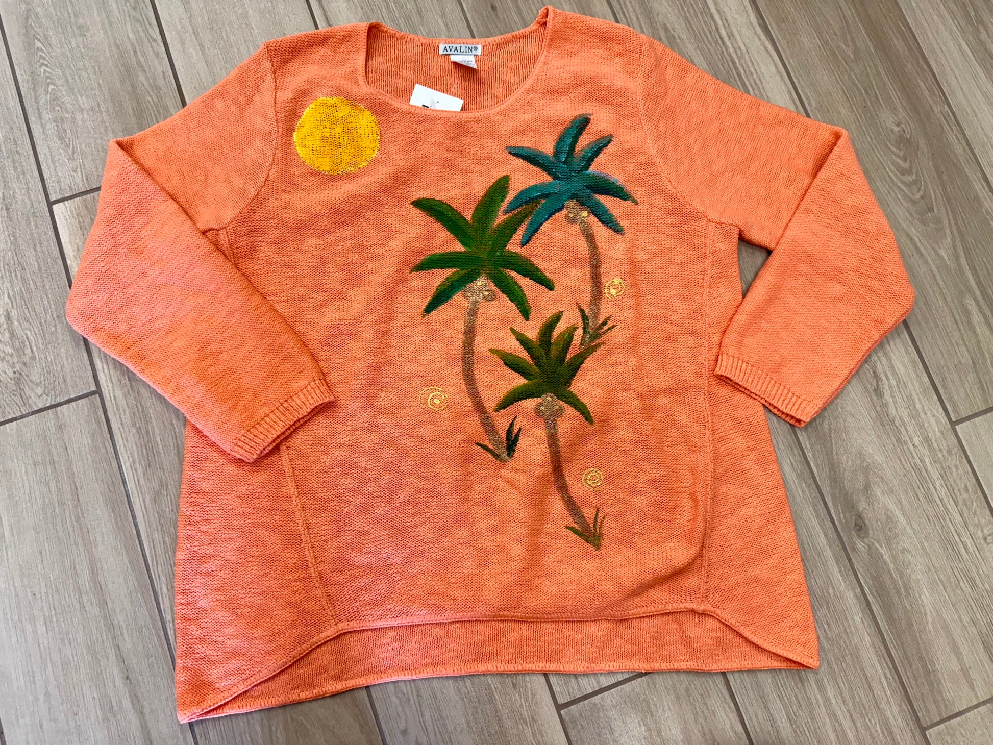 Three fun and funky palm trees stand front and center on this painted sweater! There is even matching artwork painted on the back too!