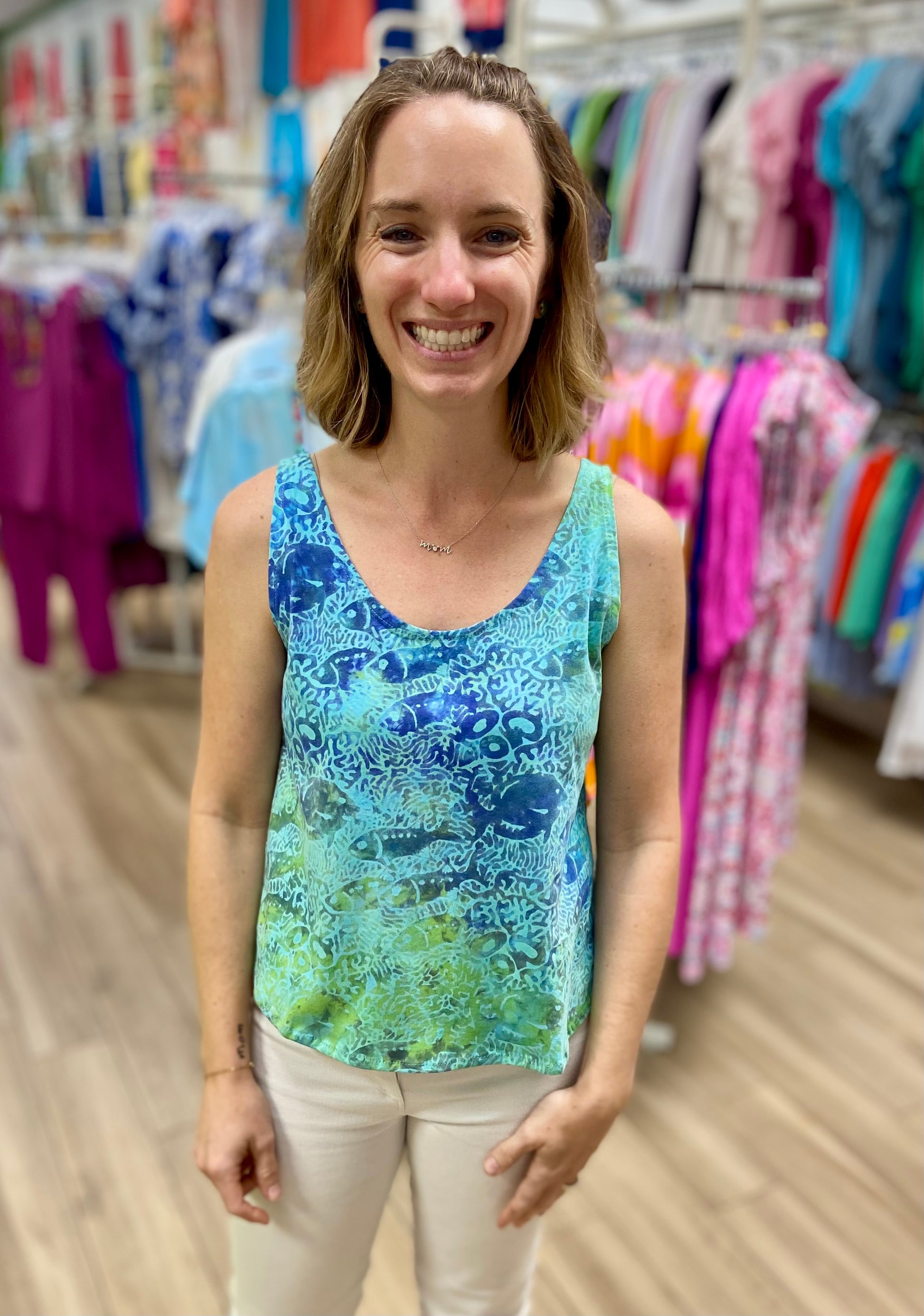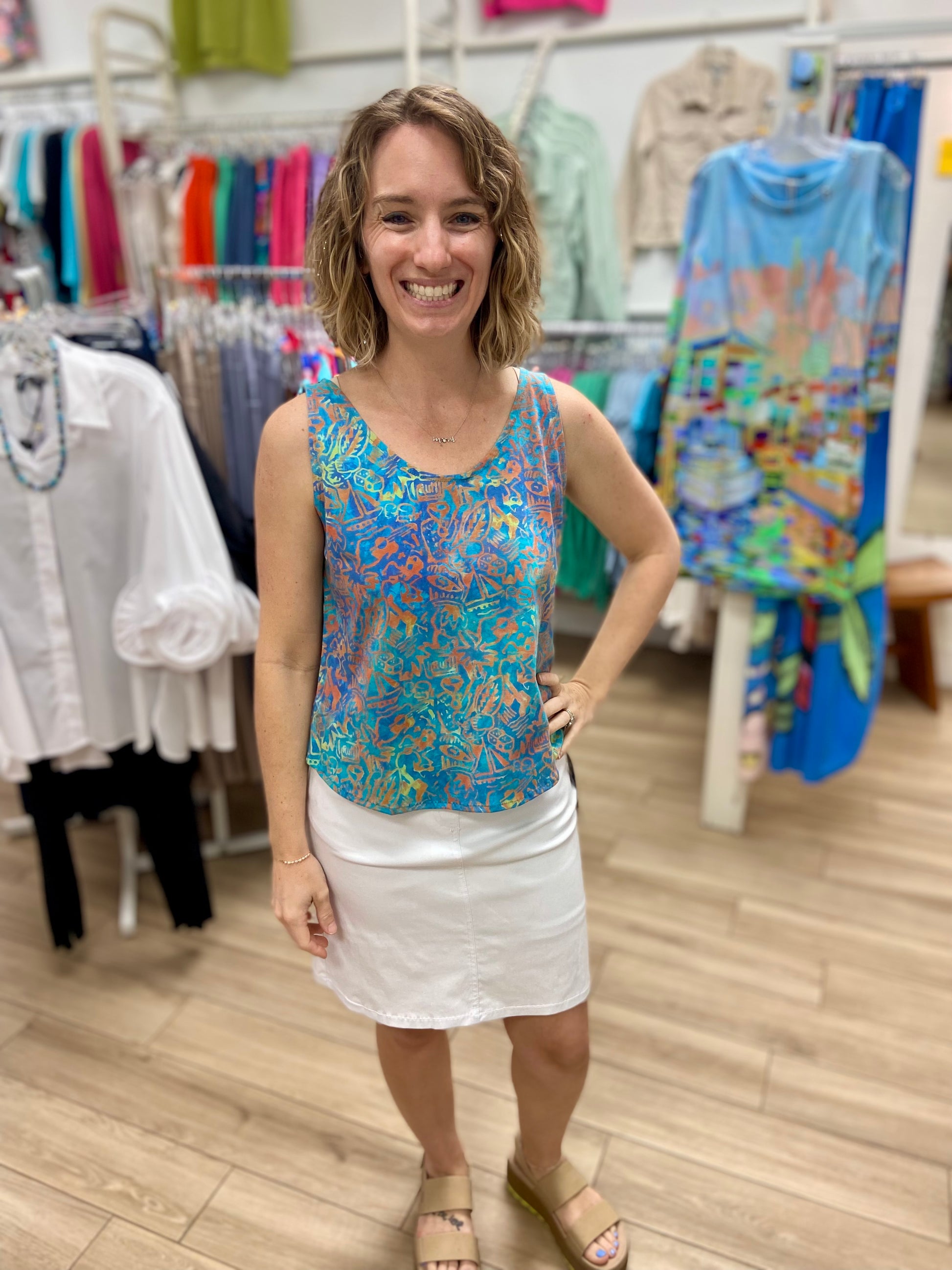 A fun printed tank can make a serious statement! You will love this top!