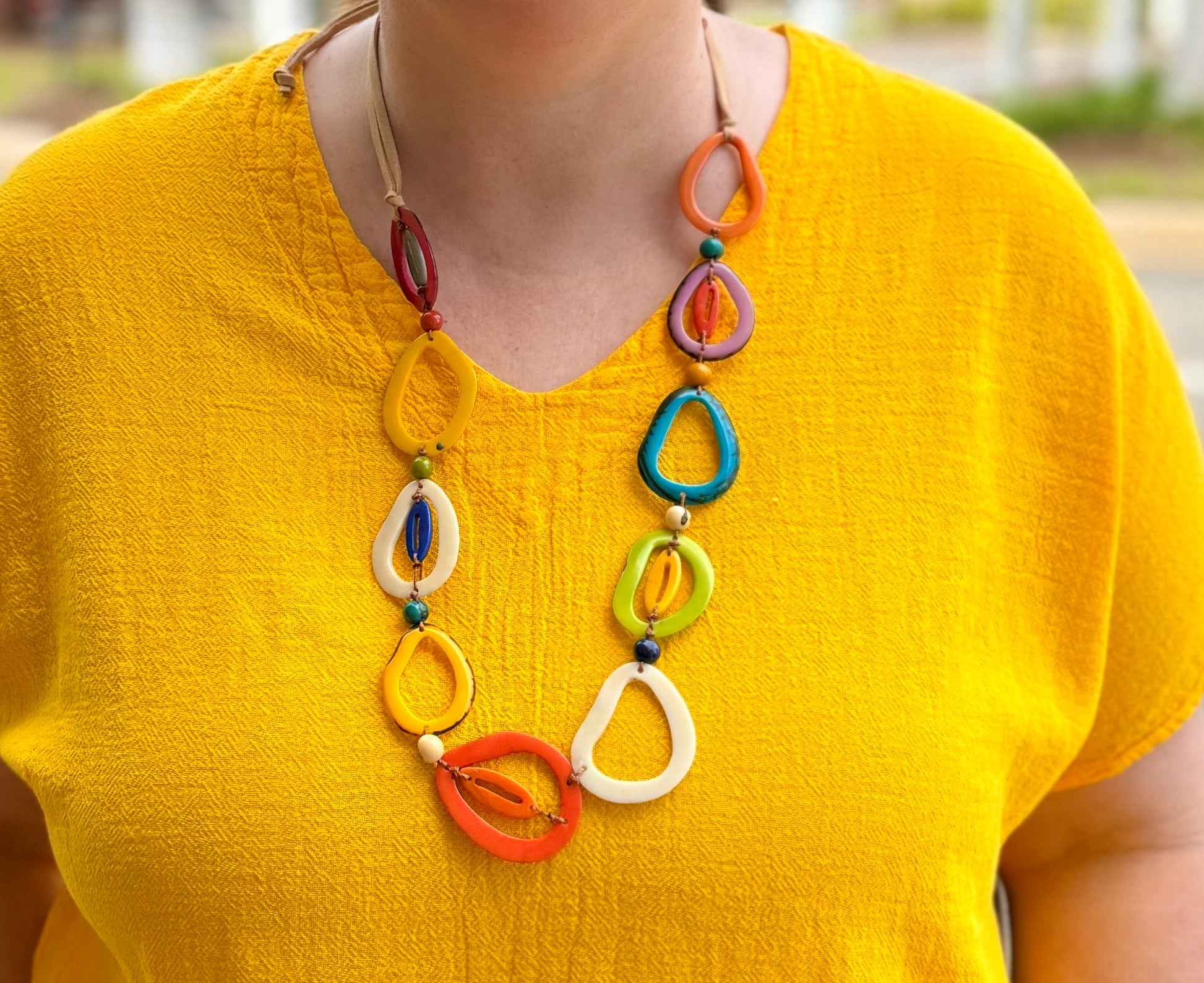 Lightweight and lovely - the Emily necklace is always a favorite for the bold colors and fun shapes.
