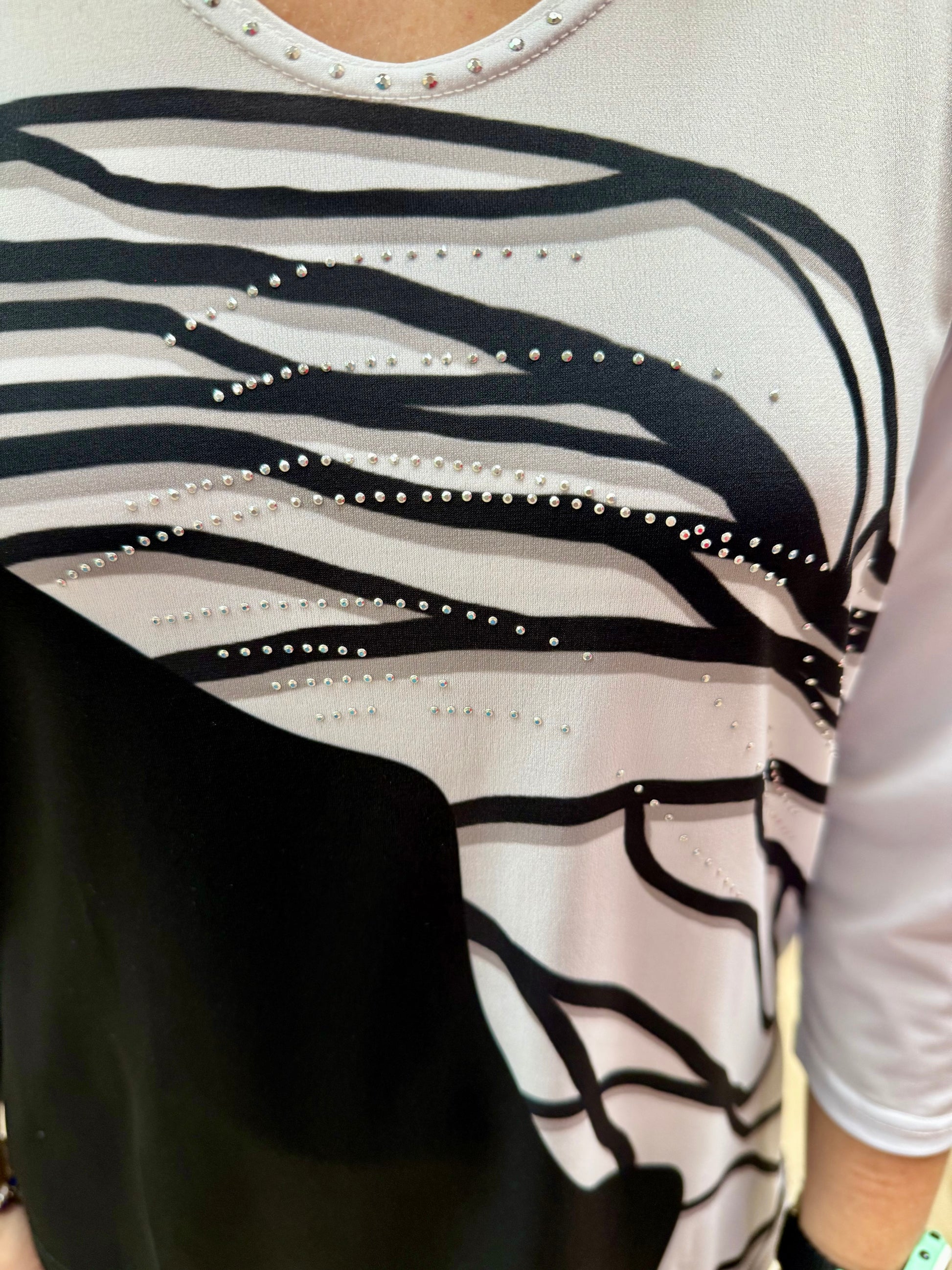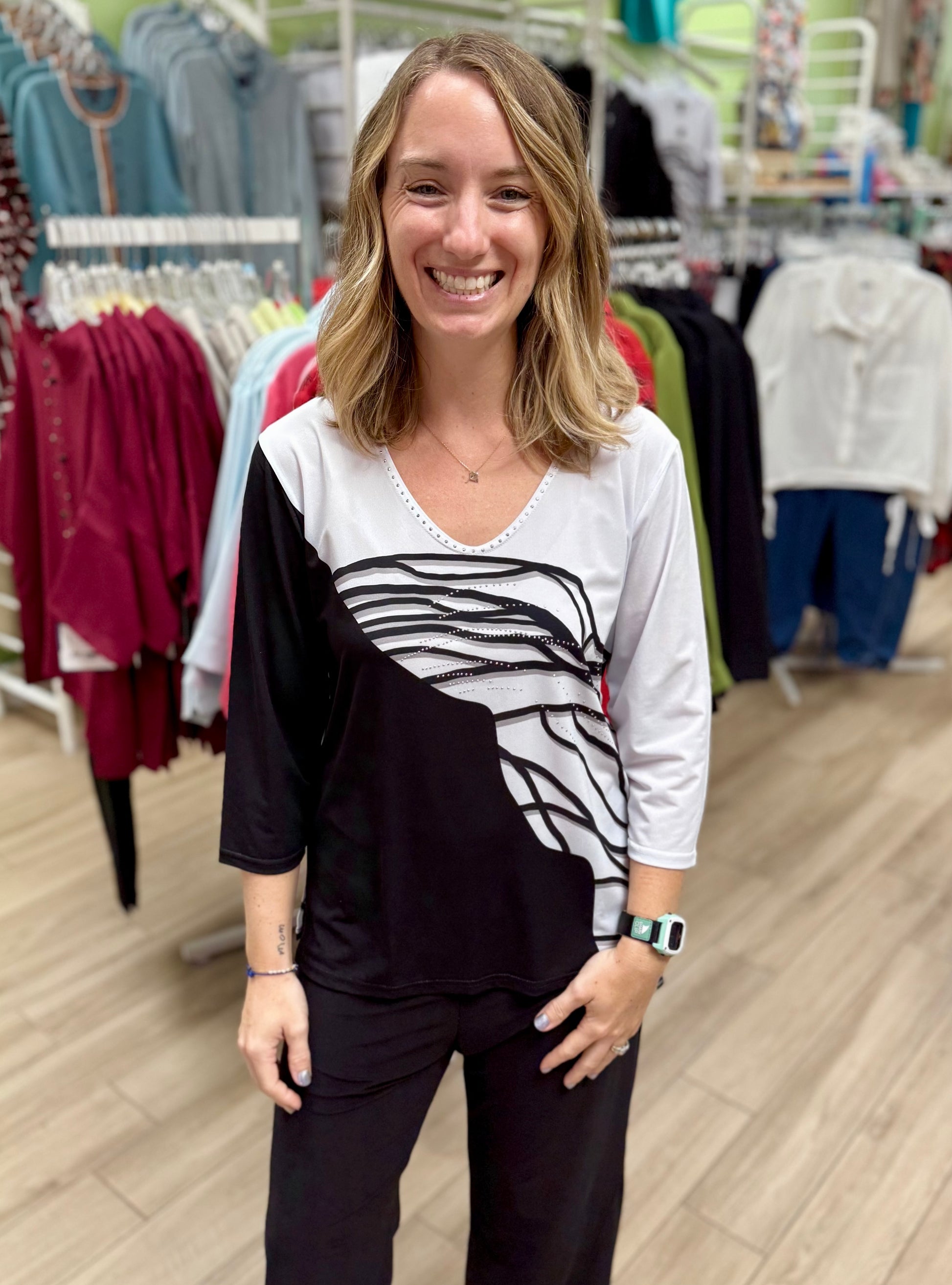 A classic black and white top with the added fun of rhinestones! You are sure to stun!