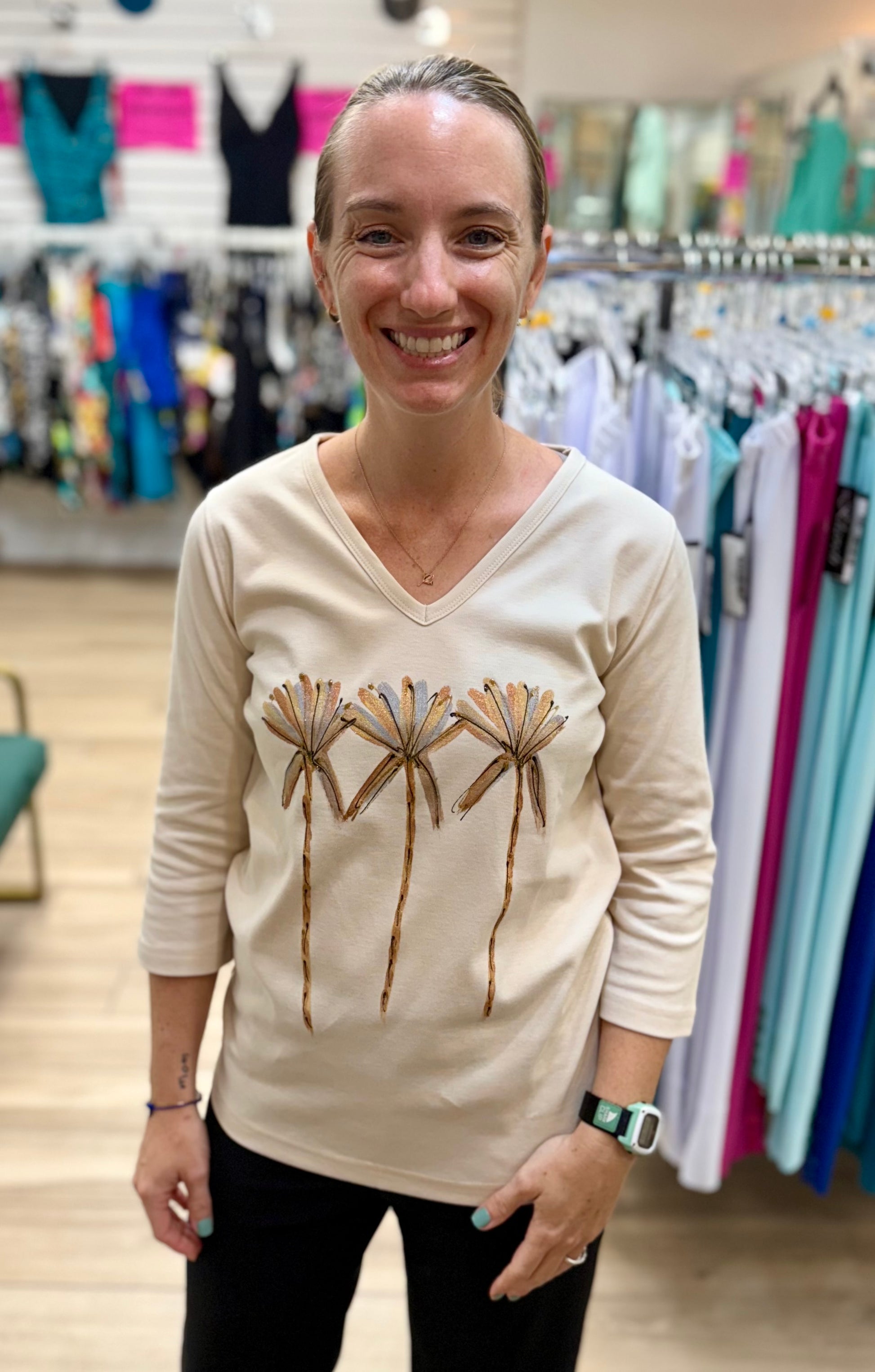 This top features her new sparkle palm trees and all tops have matching art on the back.