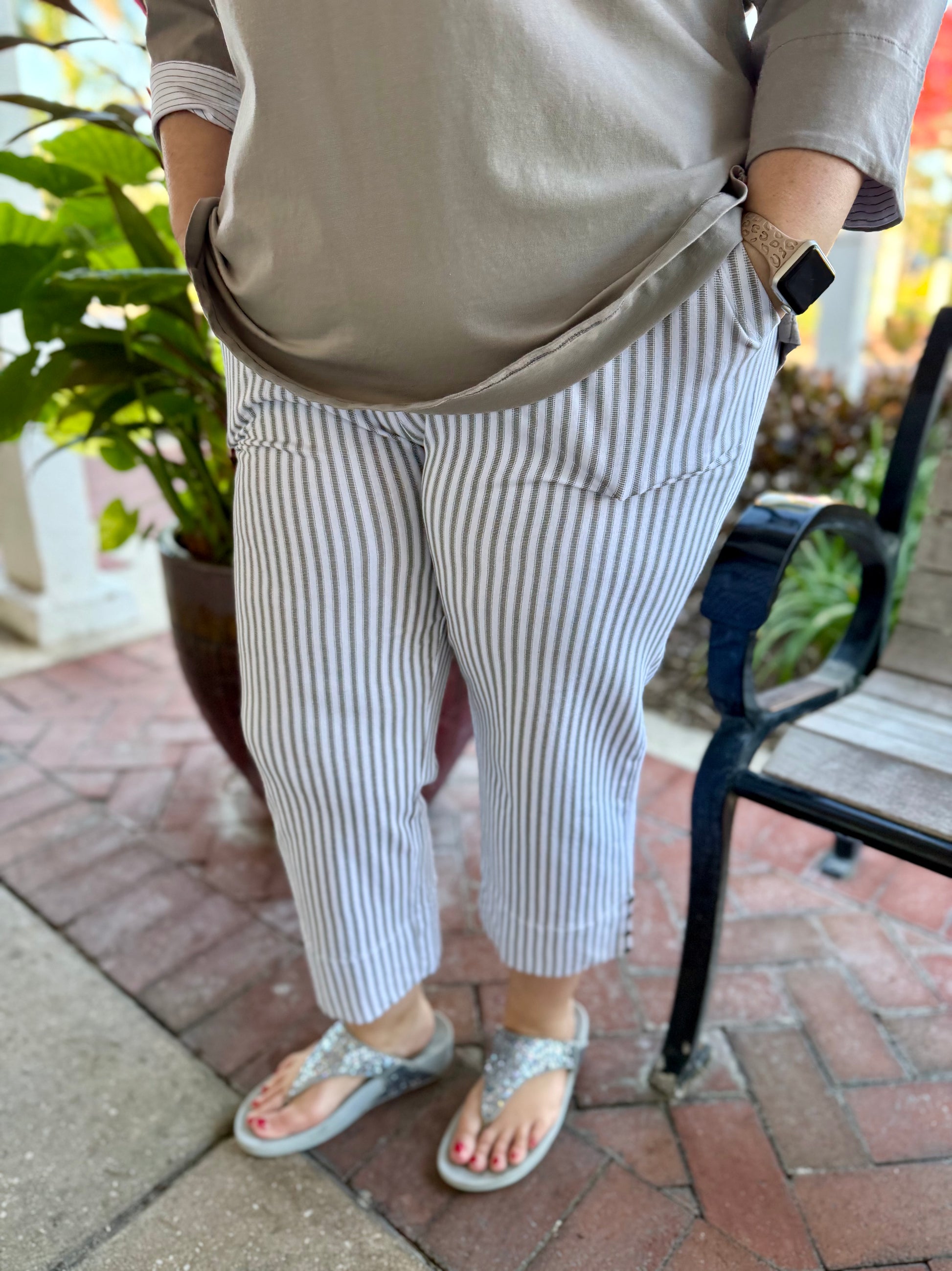 A fun stripe capri in soft, stretchy cotton! The button details at the ankle add extra style!