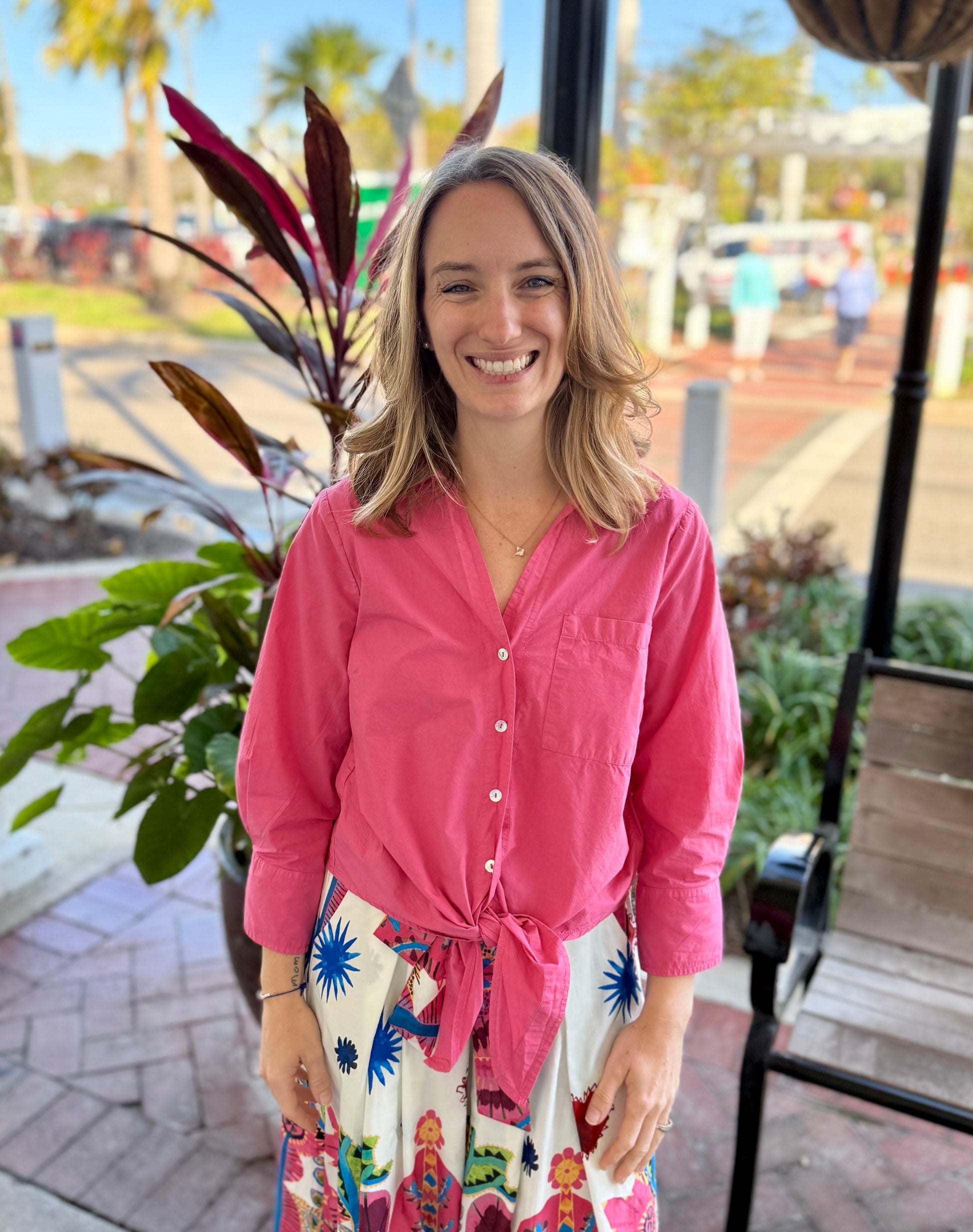 A fun and stylish button down improved by adding the tie bottom detail! Enjoy your day in this wonderful top!